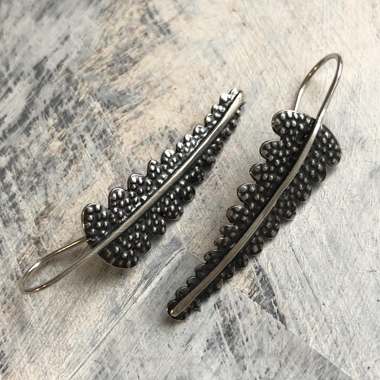 Cast, textured, oxidised silver earrings. Approx 3.5cm in length and 1cm wide. In oxidised silver