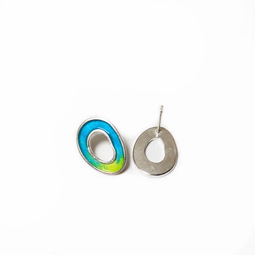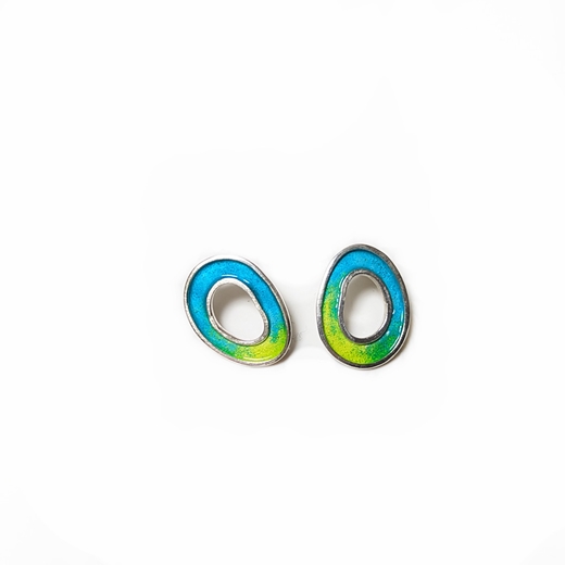 Asymetric in design, a colourful pair of studs in sterling silver. The silver frames are inlaid with a swirling mix of vibrant vitreous enamels in blue green and lime yellow. The ear studs have a post and scroll fitting and have a polished finish.