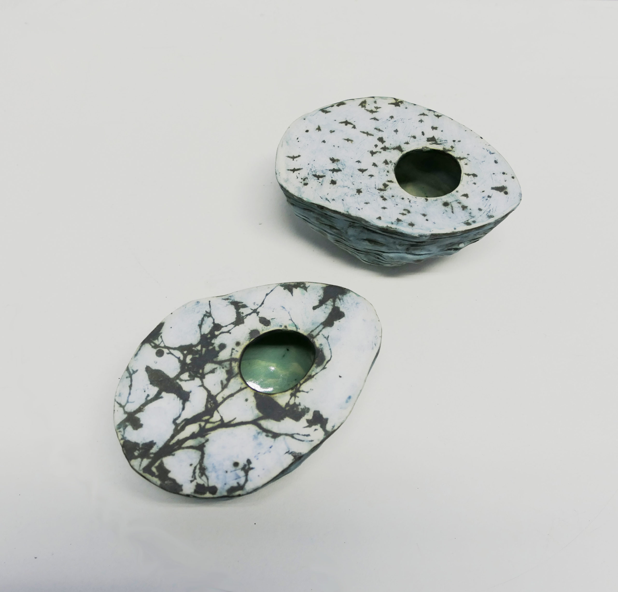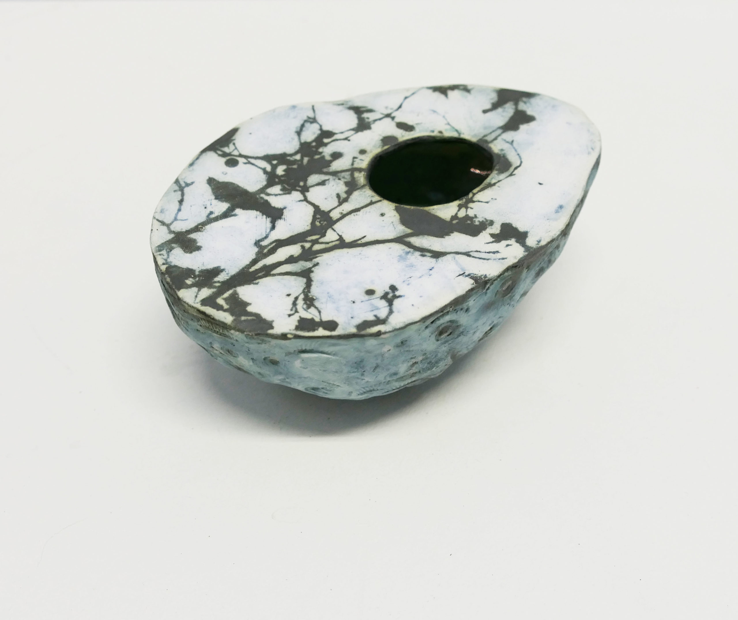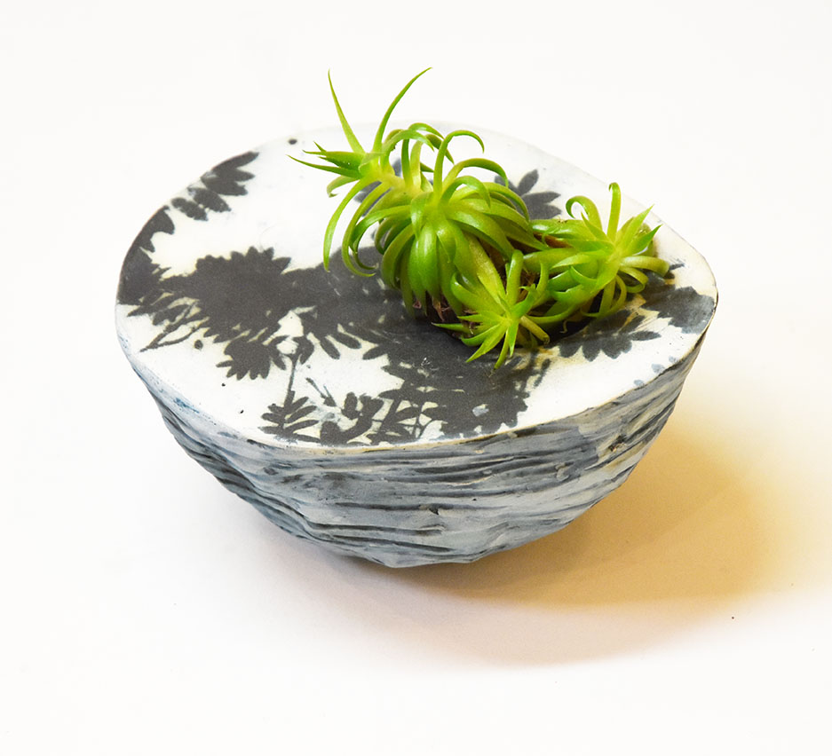 A beautiful take on a planter, we love how she has created a pebble like form and continued to carry her organic inspirations throughout. Even on the edges of each piece, fossils and waved textures can be found alongside her black and white images which capture the details of nature in an expressive manor. This planter involves an image a ‘Bird in a tree’ with a succulent from my garden showing you how the planter looks when is use.