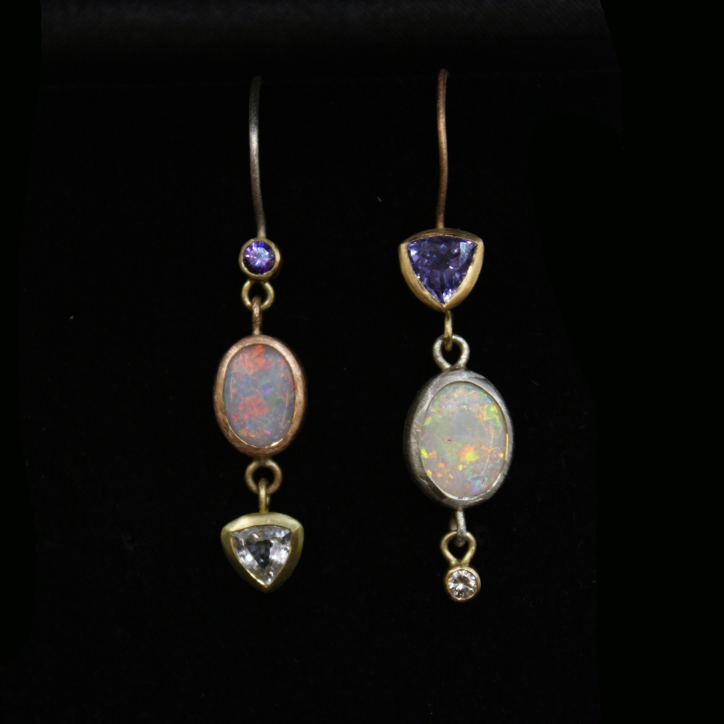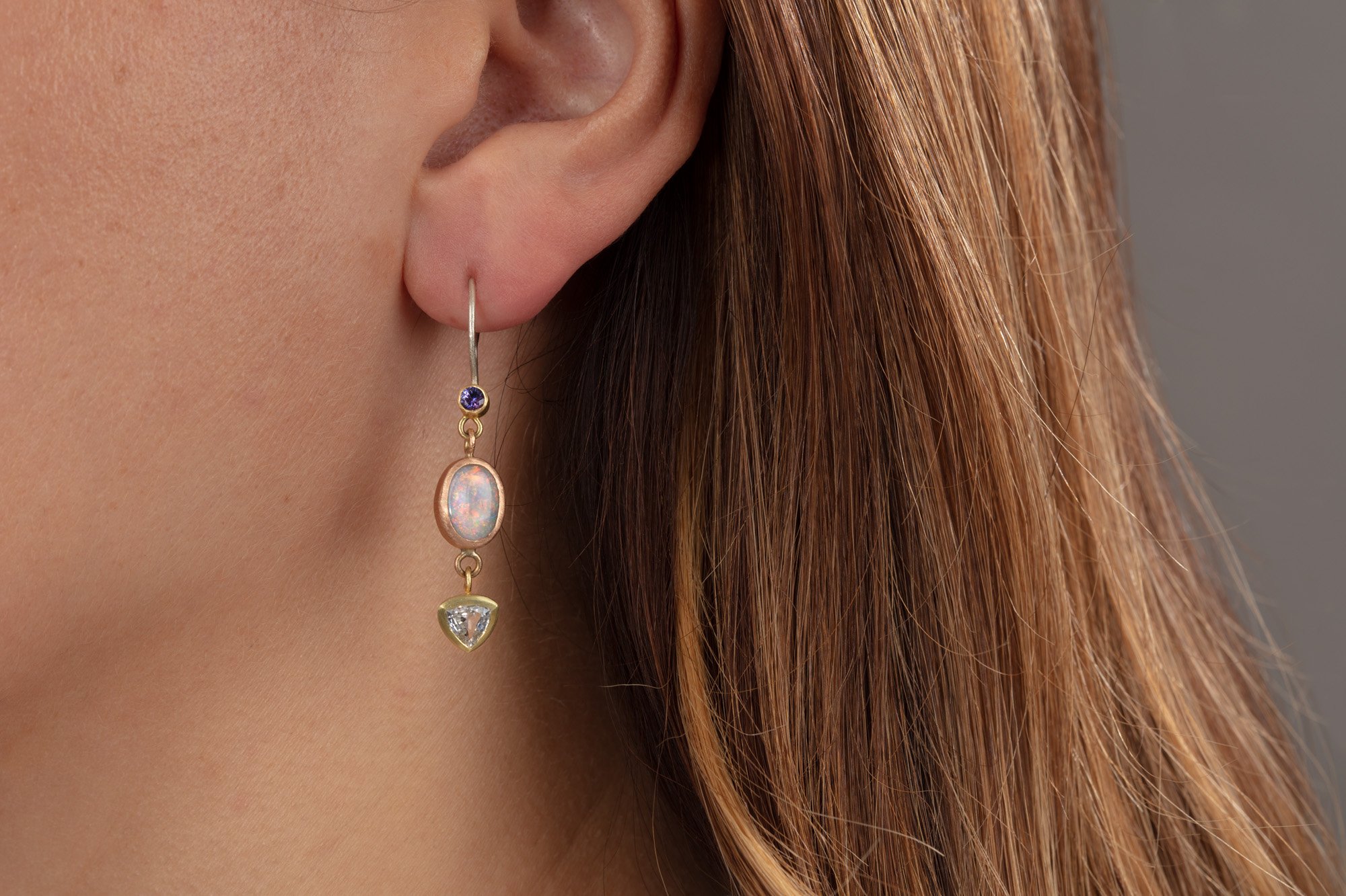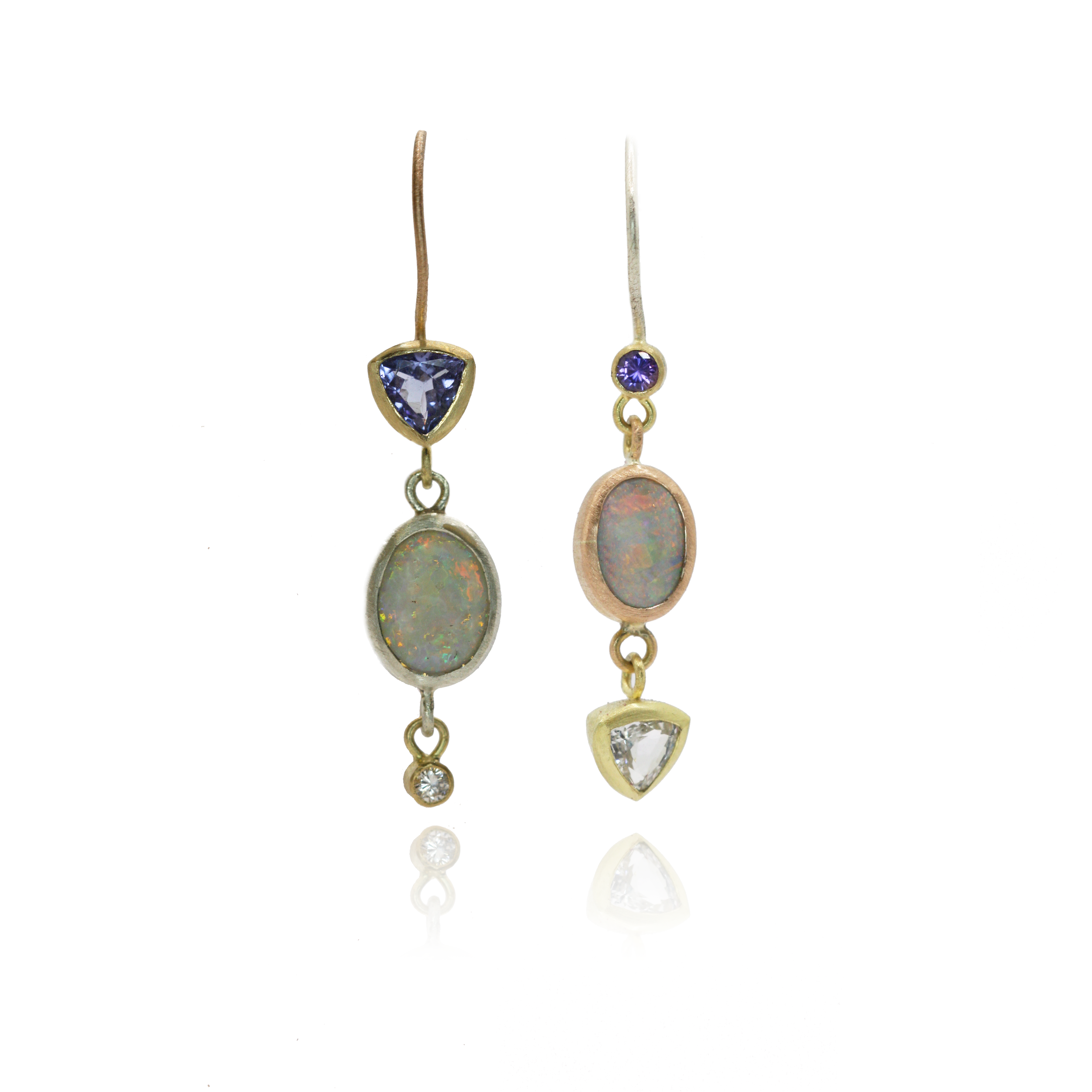 These one-of-a-kind earrings feature opals, tanzanite and sapphires. gemstones sit in rub-over settings made of 18ct green and yellow gold, 9ct white and red gold, which we alloy in house.