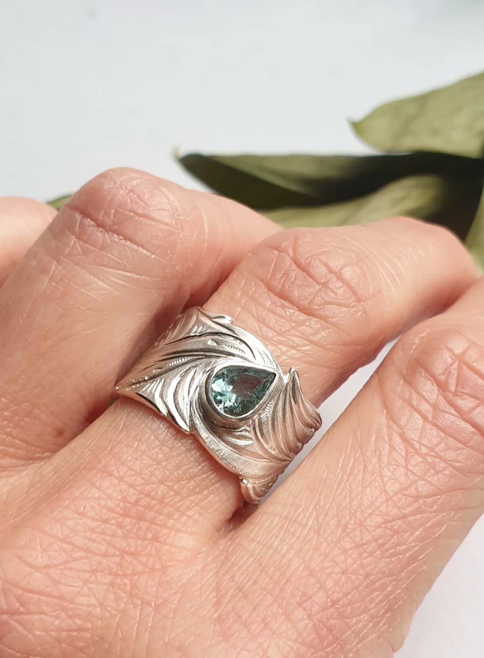 A statement silver chased ring incorporating detailed wave marks.