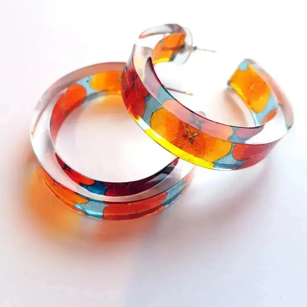 - These Orange Hydrangea Hoop Earrings are part of the Recycled Contemporary Jewellery collection. Each piece is unique and individual. Sue was inspired to make them when looking at the range of Oranges in a blood oranges. It’s inspired by the combination of deep red/orange and vibrant orange against a soft blue which makes the colours r colours really shine out. The handmade hoop earrings made using real leaves and flowers so each one is unique. These floral earrings are made with real hydrangea flowers which are embossed onto the inner surface. As the wearer moves the earrings look at some angels transparent and the in brilliant colour.
