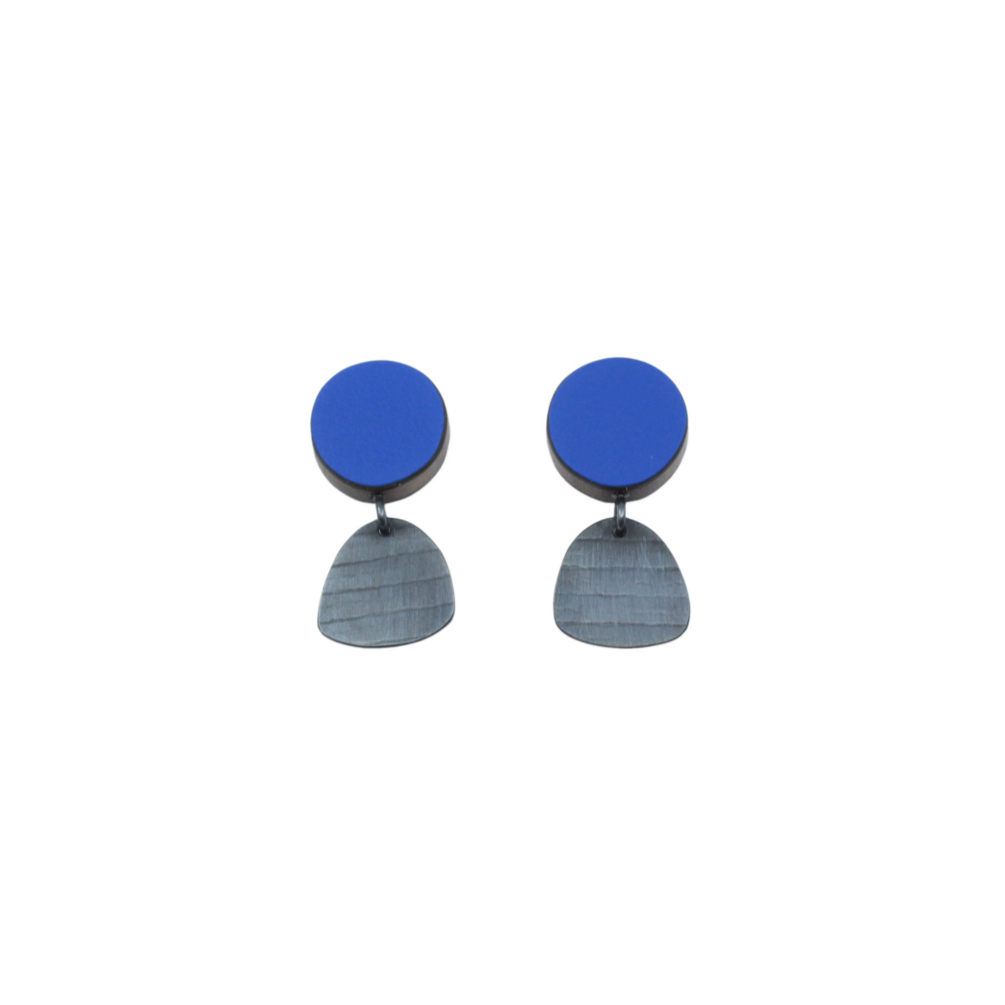 Small colourful stud earrings combining a pop of colour with tiny stripy oxidised silver drops. The Walnut and Formica circles are cut by hand and waxed for a beautifully smooth finish.