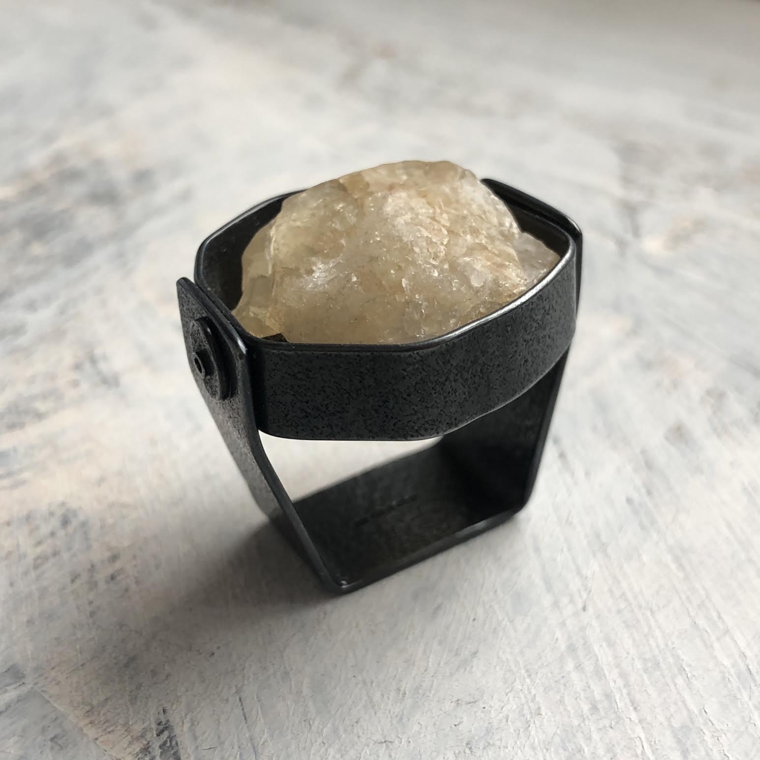 Natural unpolished semi precious stone nugget with a silver surround and an extra border. Size of stone varies. This one is an uncut citrine with an oxidised silver band