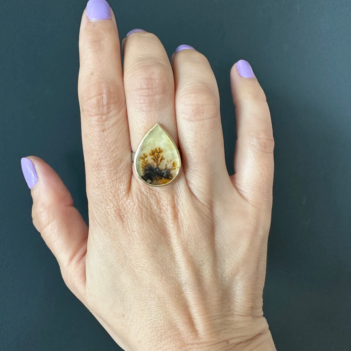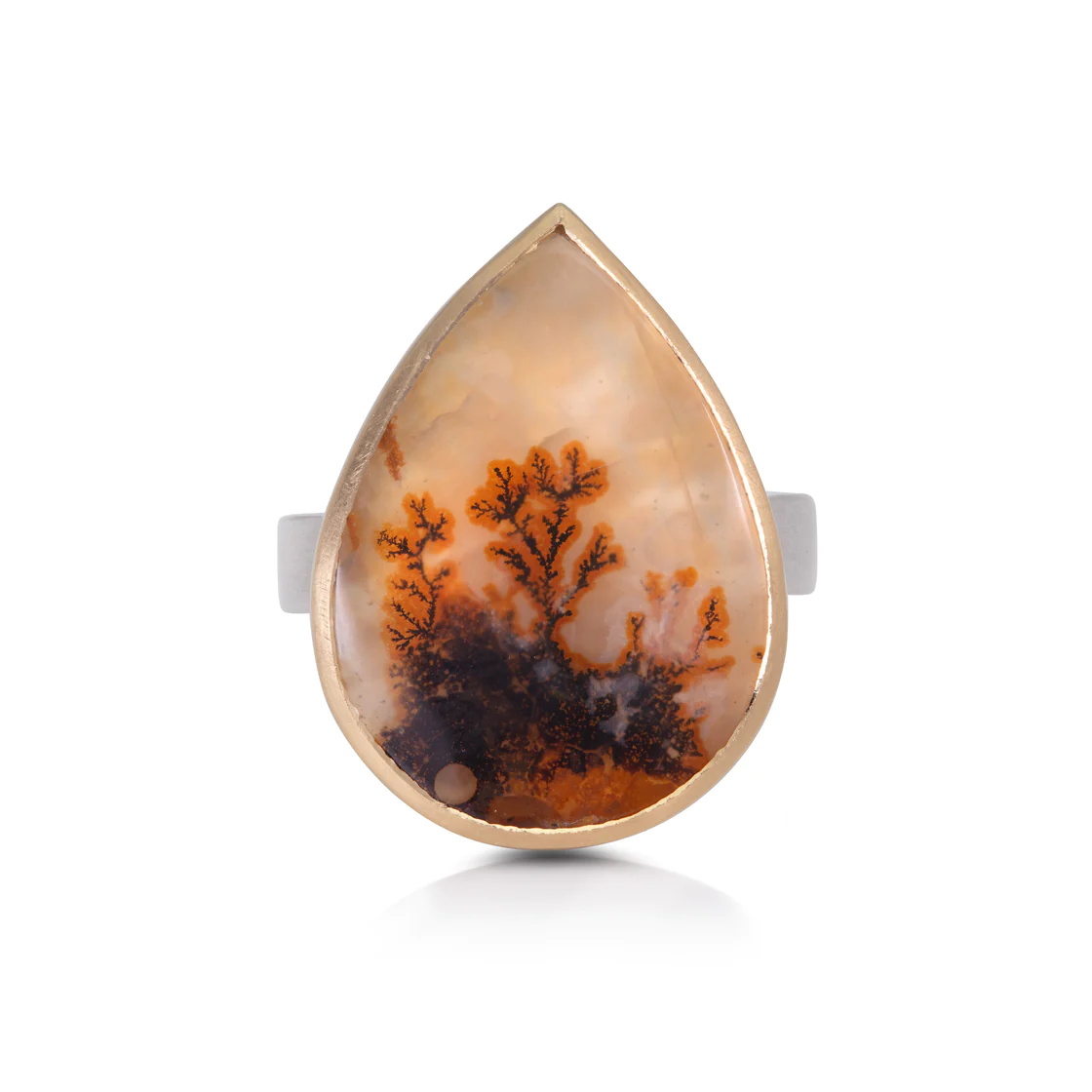 A beautiful large pear shaped dendritic agate set in an 18ct gold bezel with a silver base and band. This stone contains warm orange tones alongside the darker dendrites. The silver band is made from half round wire with the curve on the inside which gives a very comfortable fit
