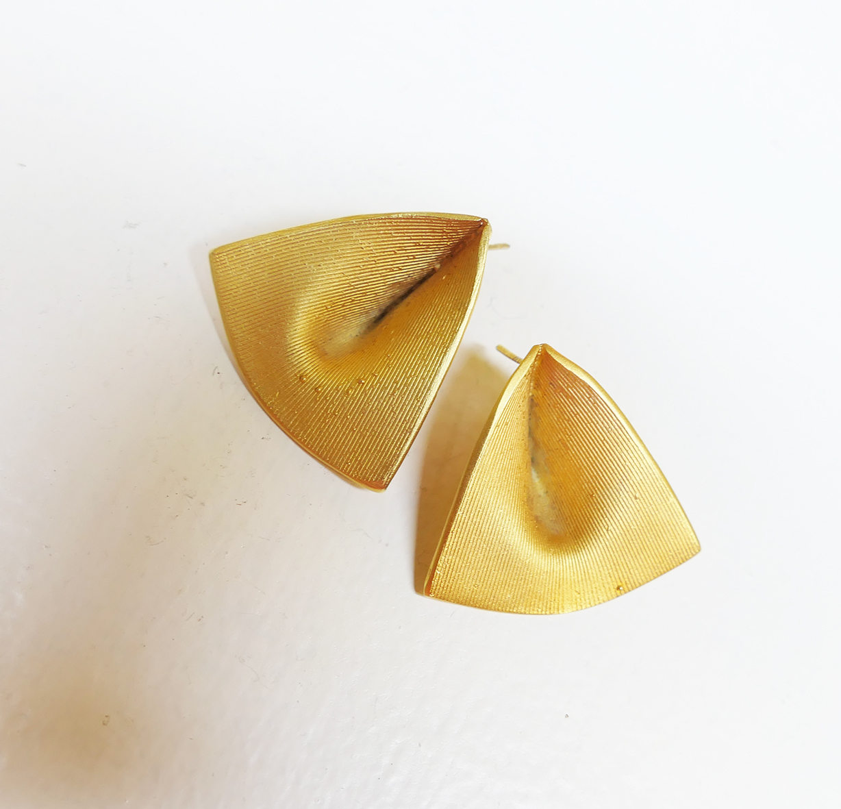 A string pair of Gold plated on silver earrings. These earrings are a true statement in a matt 24ct yellow gold plated finish. They fold around the face and elegantly sit on the earlobe.