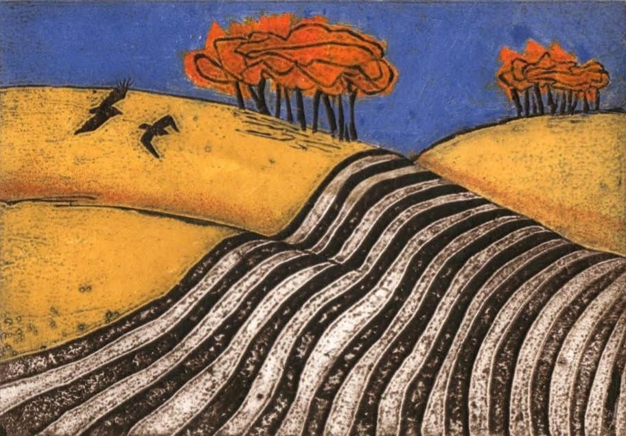 This small collagraph would sit comfortably anywhere in the home environment and still create a big impact due to the colours she has used.