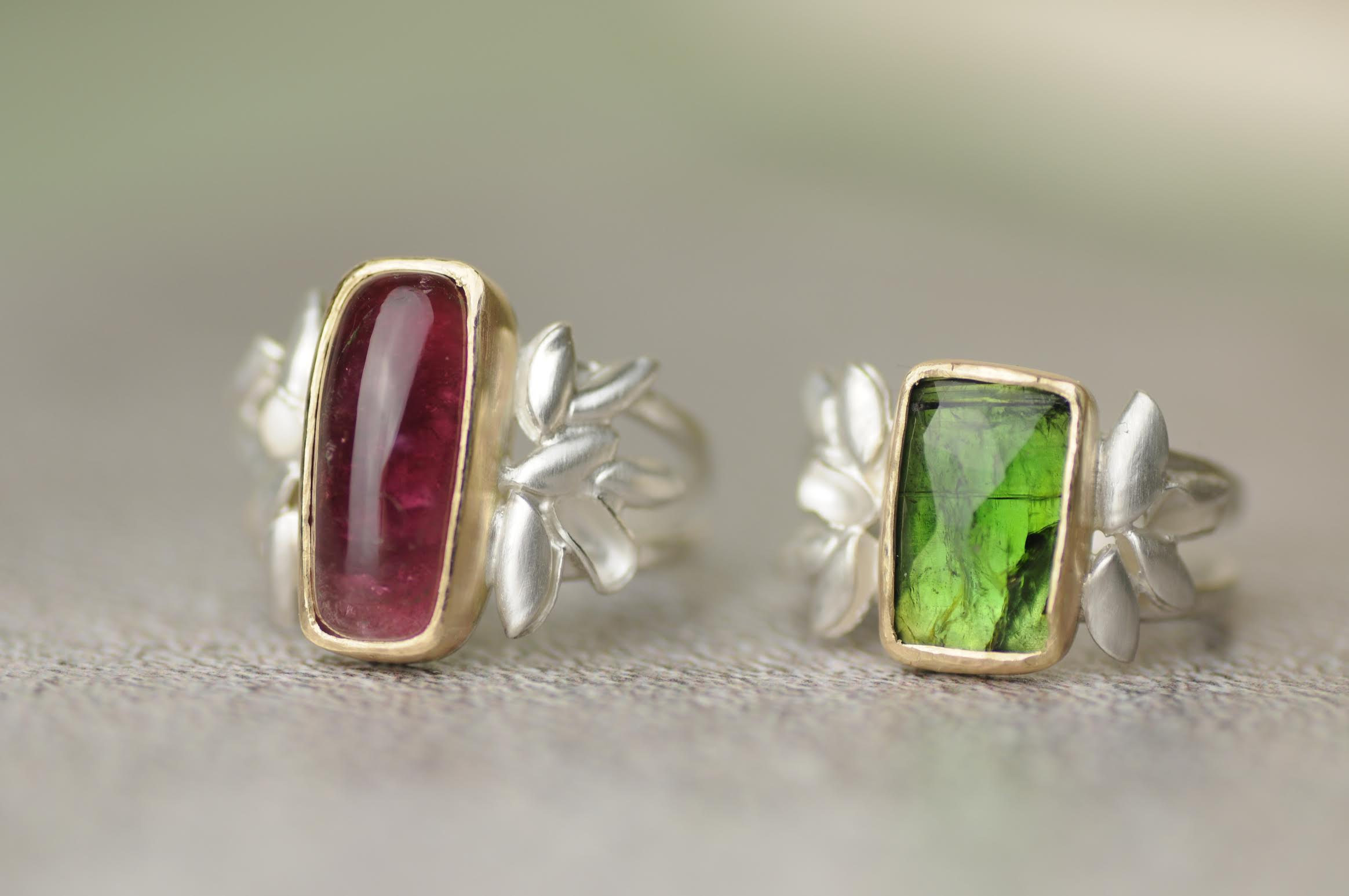 A beautiful classic design by Rebecca Burt featuring her silver leaf forms that encapsulate a beautiful Green Tourmaline stone.