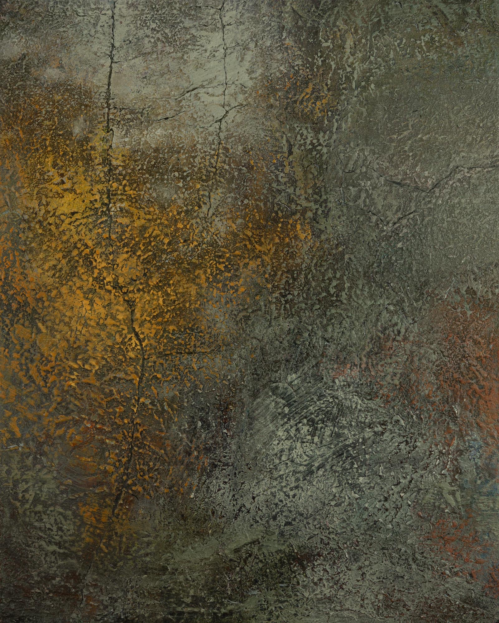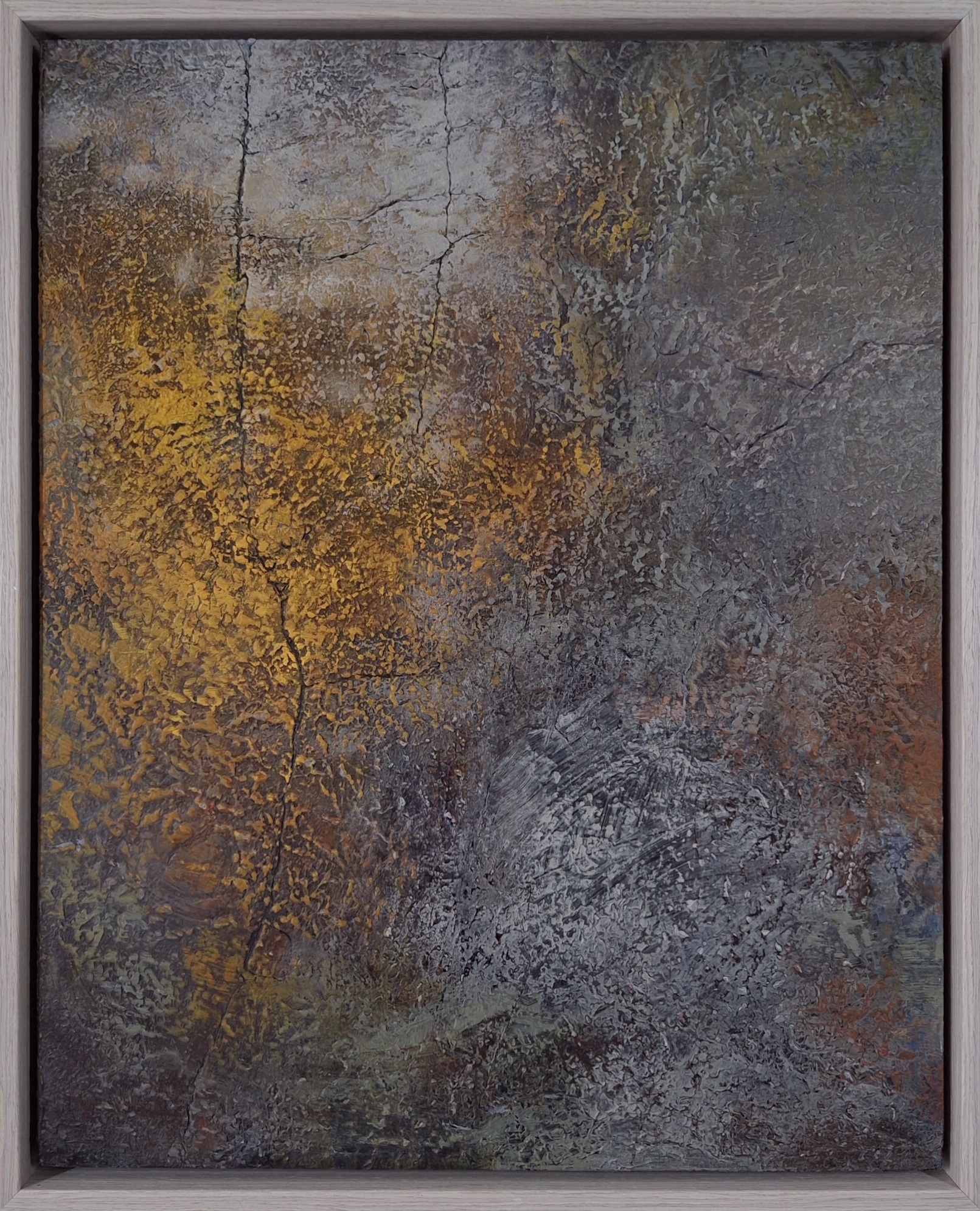 A stunningly beautiful textured mix media painting. That has taken a long time to layer up a dry to create this very textured piece, originally started in 2015. Claire has observed the lichen which is so commonly seen on our iconic dry stone walls of this area. The particular image was taken outside Hellifield and she has very cleverly worked with oil paint to create rich organic textures and earthy tones with a citrus yellow popping through.