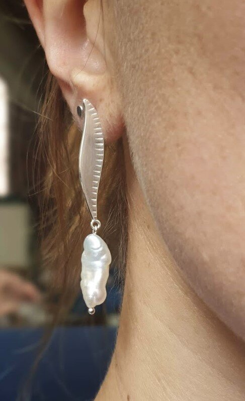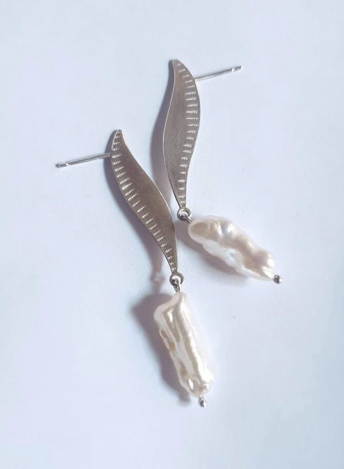 A beautiful pair of earrings that can be worn everyday or for special occasions. We love the texture found in the beautiful natural Keshi Pearl combined with the textures in the silver drop element.