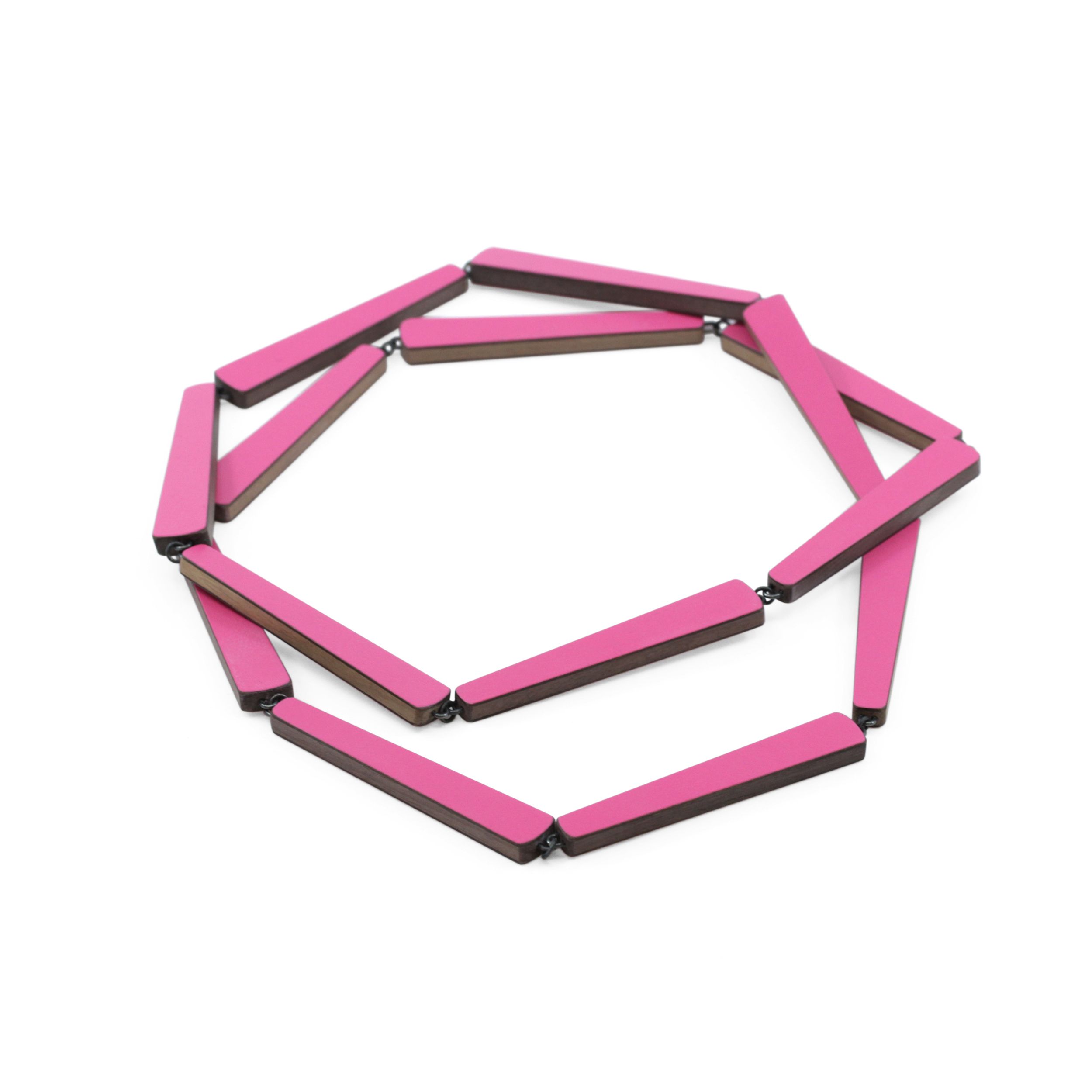 A colourful chain/necklace made from walnut, Formica and oxidised silver. Each piece is hand cut and waxed by hand for a beautiful smooth finish. It has lovely movement and adds a pop of colour to your day.