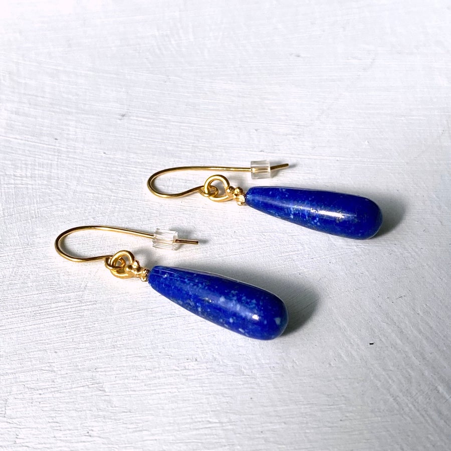An elegant Lapis Lazuli drop with a gold granulated top. We feel these earrings are a classic design, which we think should be a must in everyones Jewellery box. The have captured the beautiful stone of creativity in a pear shape which totally compliments the gold granulation above.
