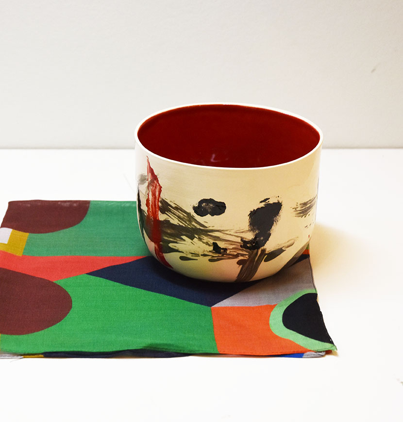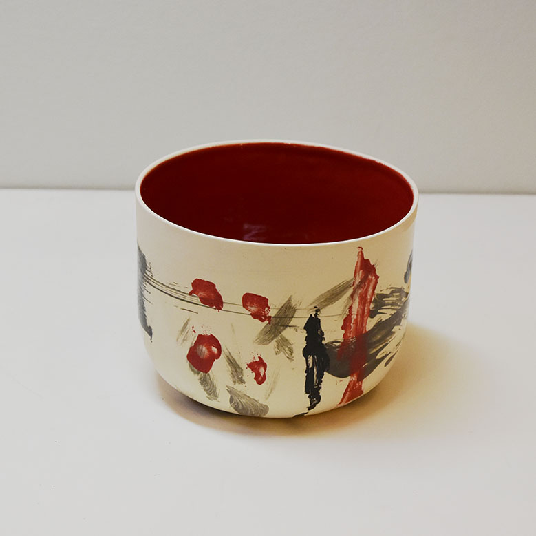 We love the expressive mark making Rebecca creates on each piece. She has used each vessel like an abstract painter would use a canvas, creating mark making and splashes of colour. Every angle you turn you see a different shape whether this is a cross or a curve each mark creates an interest. We love how this free form drawing is then contrasted with a glossy vibrant colour on the inside.