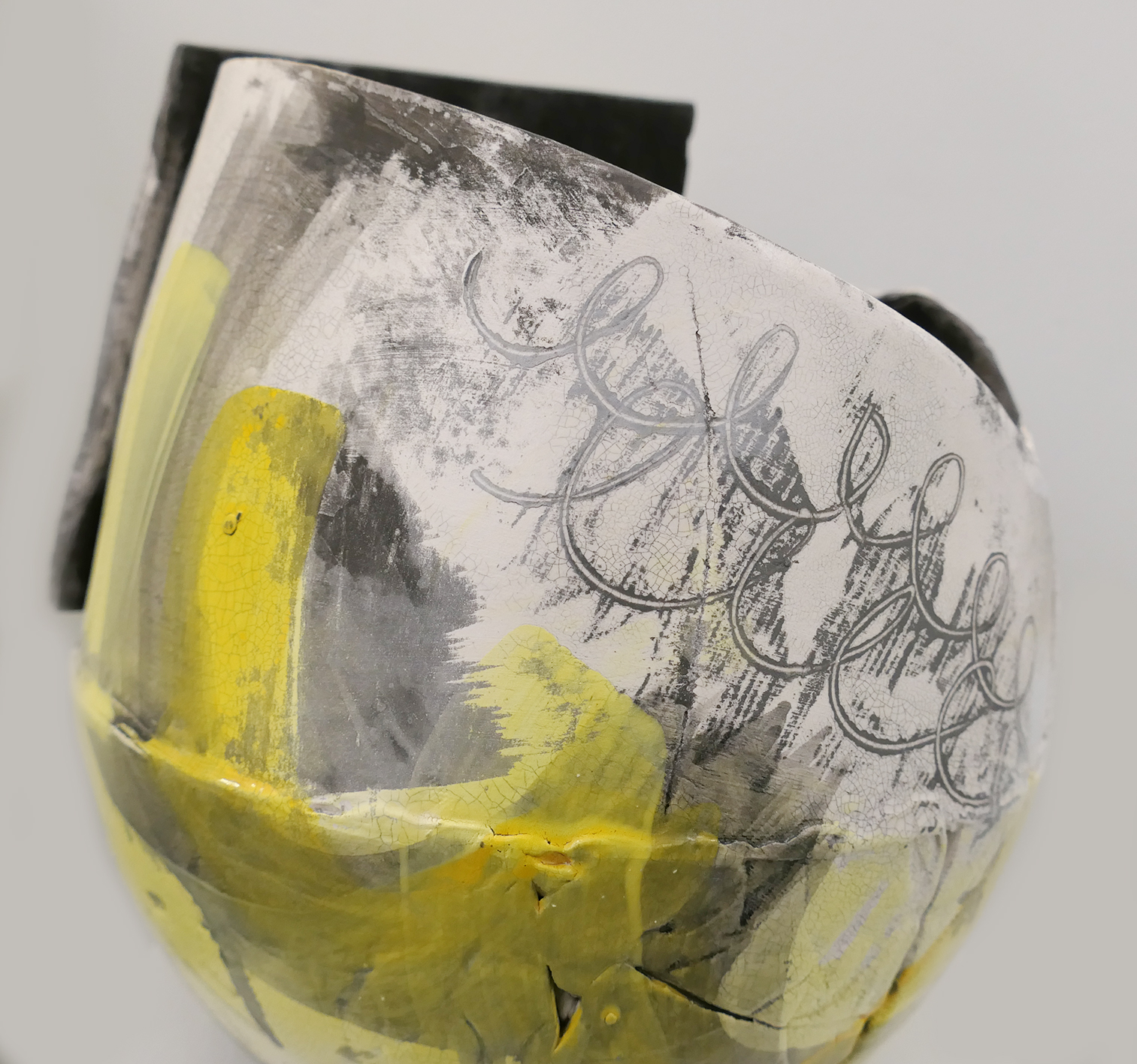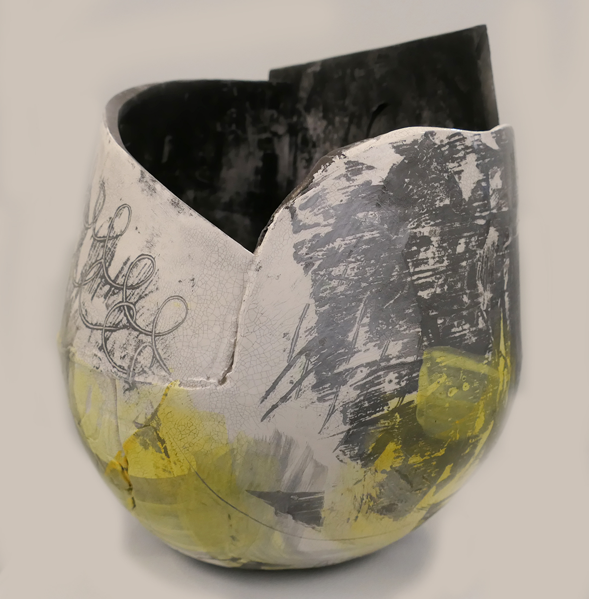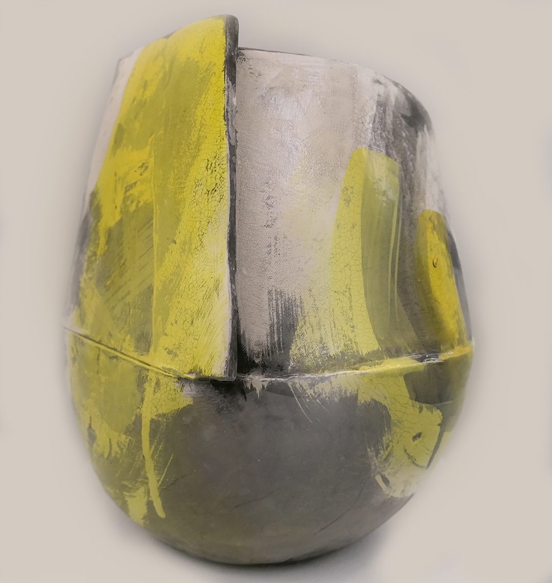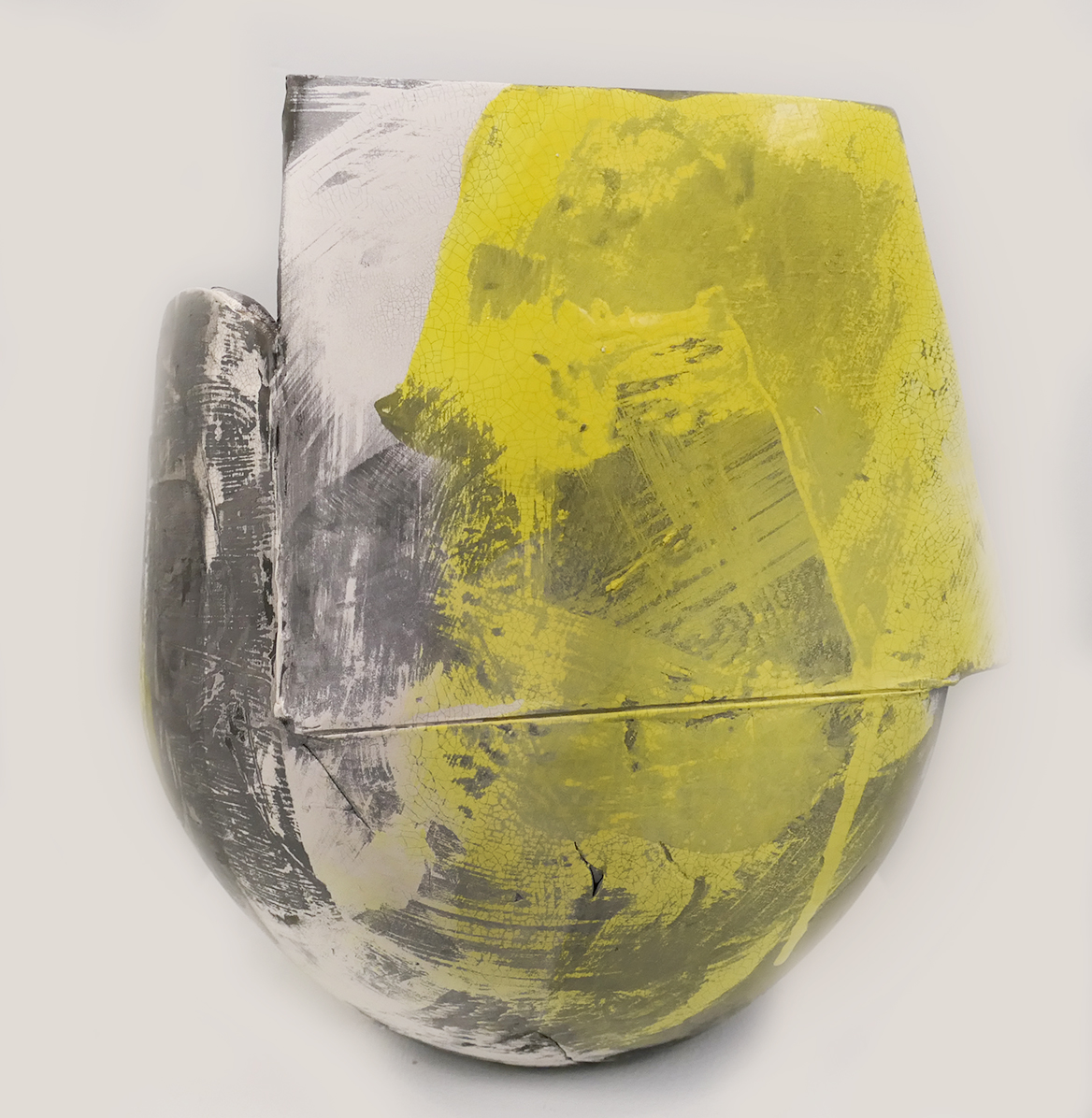 Hand Built Ceramic vessel in Yellow and Grey. Layers of slips and glazes are built up over the surface of the vessel.