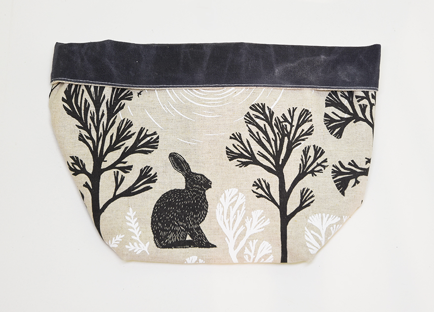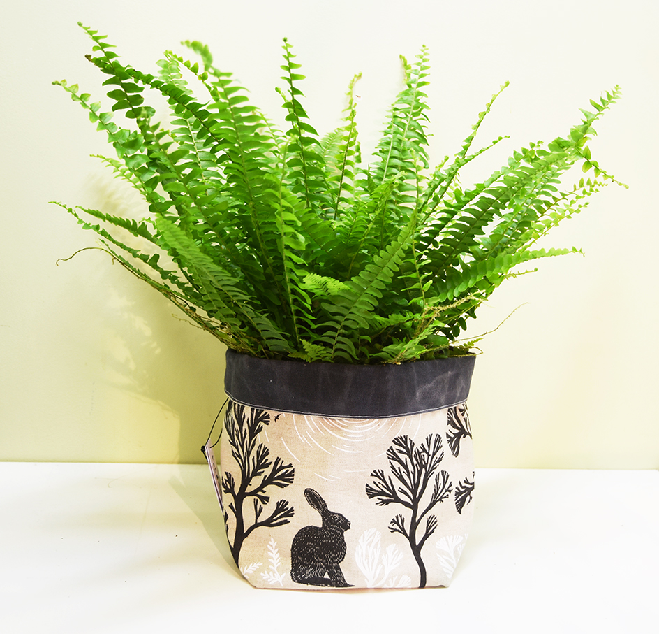We love this print incorporating an image of the lovable hare.. Screen printed using soft grey and black tones onto linen fabric. These containers are so handy they can store so many bits and bobs that we all accumulate and struggle to through away. They are also lined with wax cotton making them water prof.