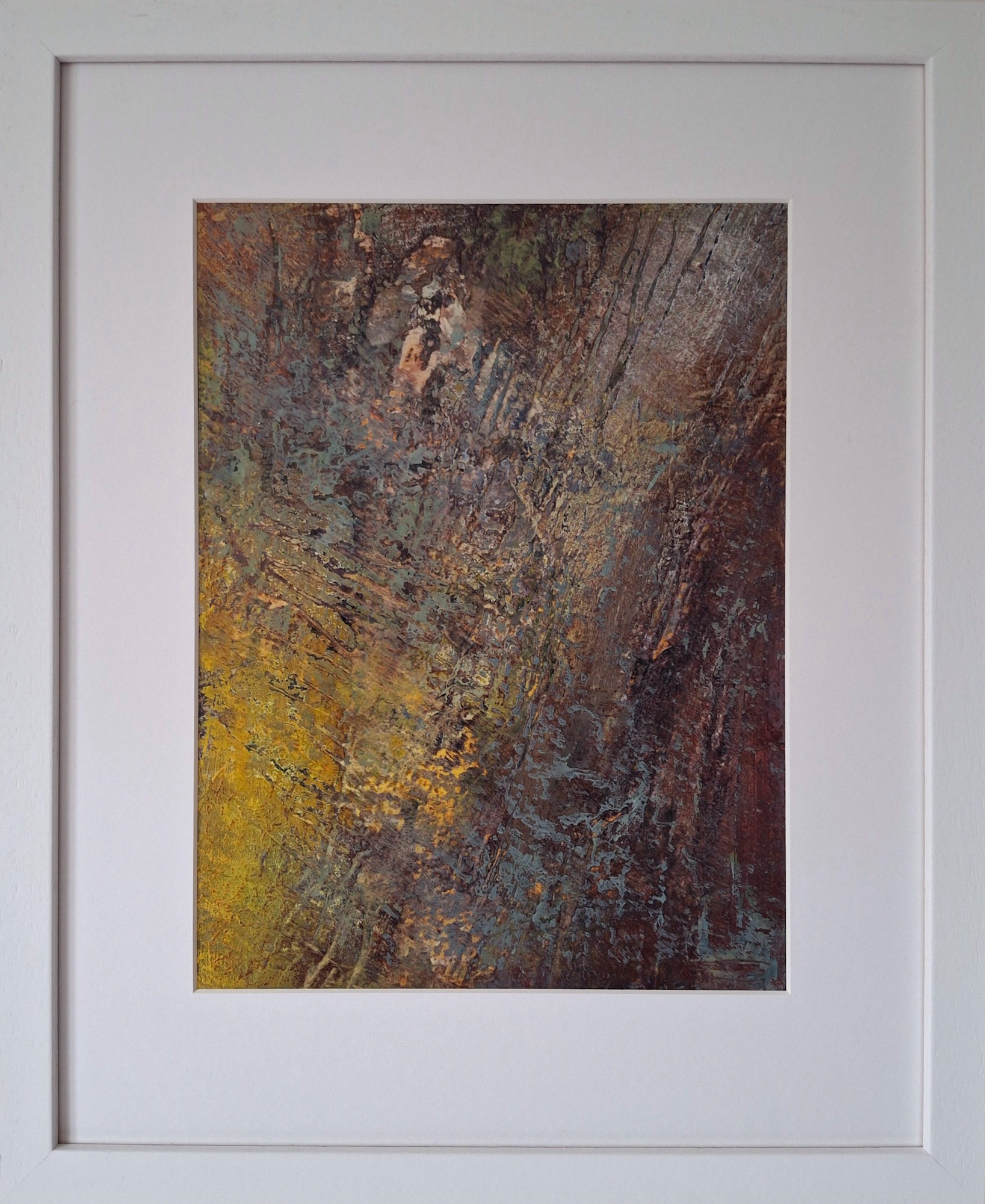 A stunningly beautiful textured mix media painting, from Claire Ninham’s moss and lichen series. All these paintings observe the closeness of textures we see everyday on our iconic drystone walls. The oil and cold wax creates a beautiful richness of texture that you see when you are drawn to observe the painting closer.