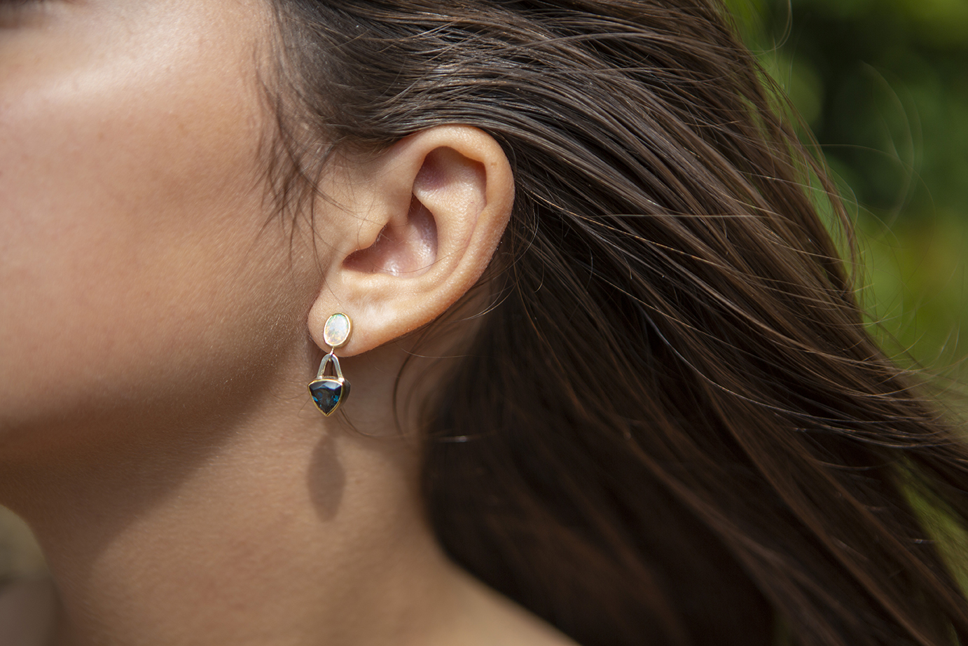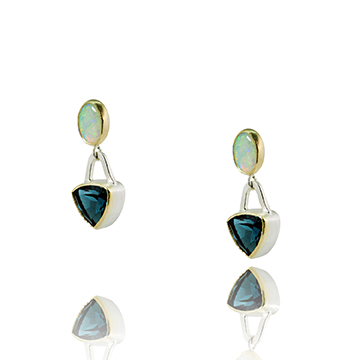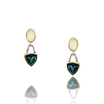 A really beautiful pair of earrings by new artist to the gallery Scott Millar. we love the colour of the deep blue London blue topaz combined with the white flashes seen in the opal.