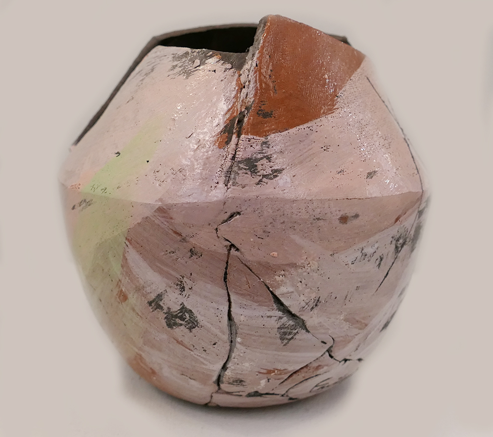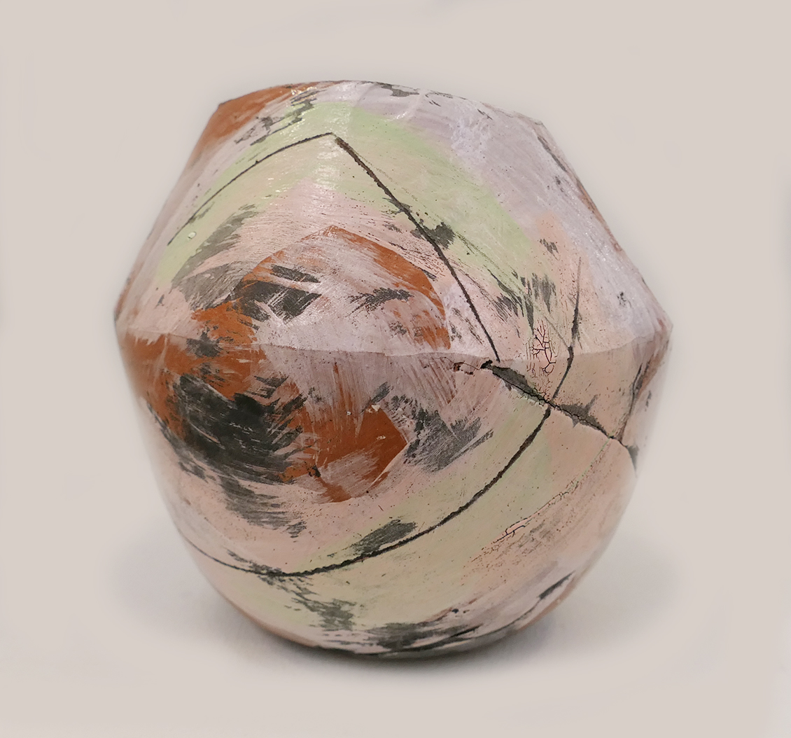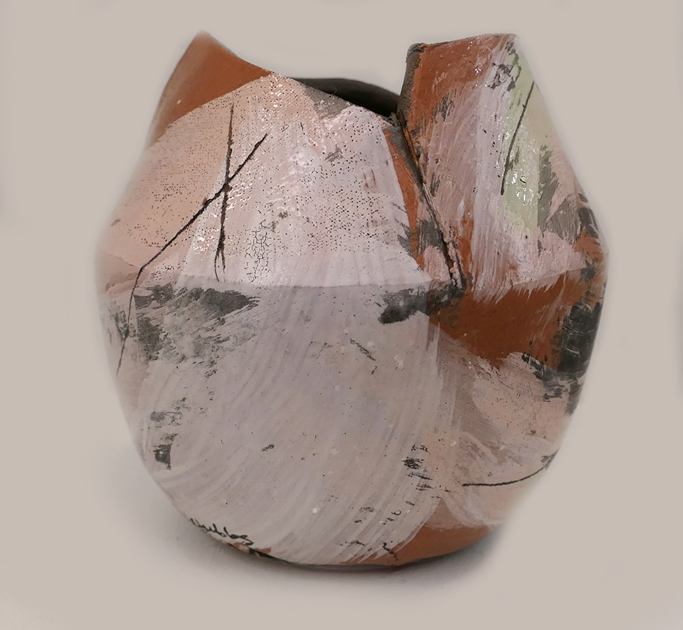 Emilys work brings a beautiful colourful feel with the use of light purple and green on this piece. She also creates movement across the surface with the use of brushstrokes and mark making techniques. Alongside this, oxides also pick out details and textures.