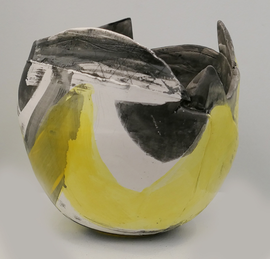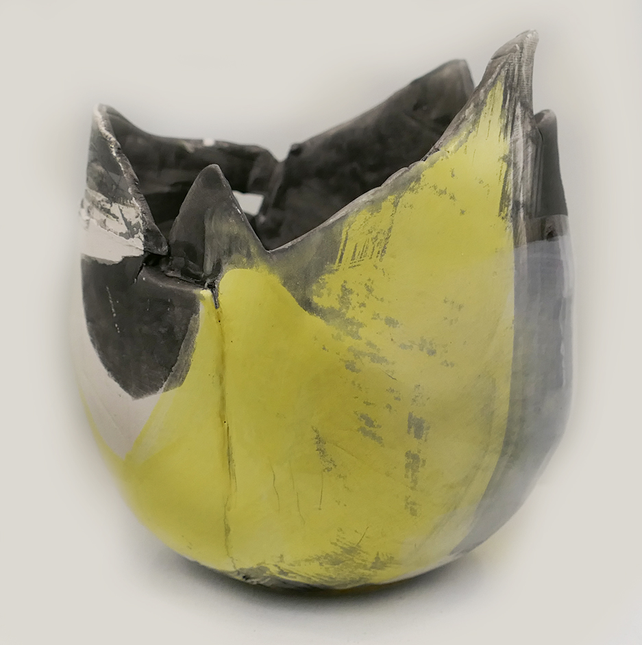 Hand Built ceramic vessel in Yellow and Grey. Layers of slips and glazes are built up over the surface of the pod.