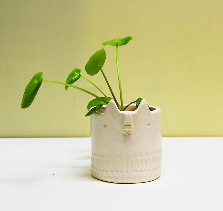 Glazed with shiny white glaze and pink facial markings.
