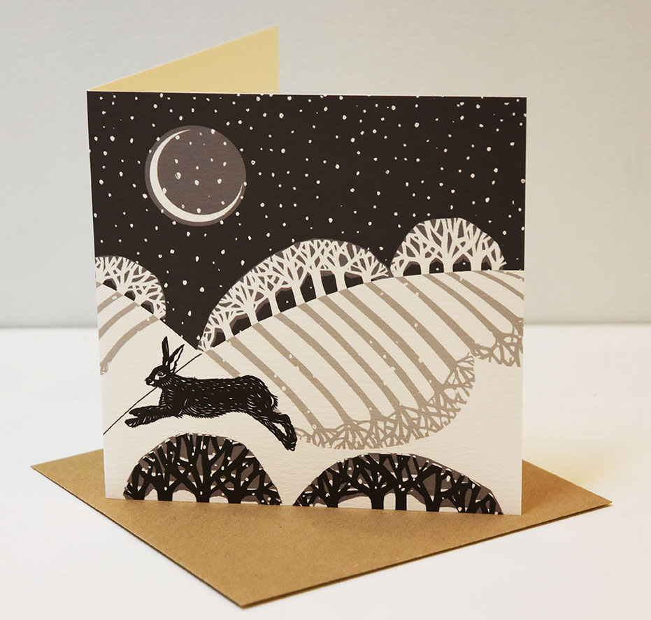 A beautiful wintery scene of the well loved hare deer leaping around in the snow.
