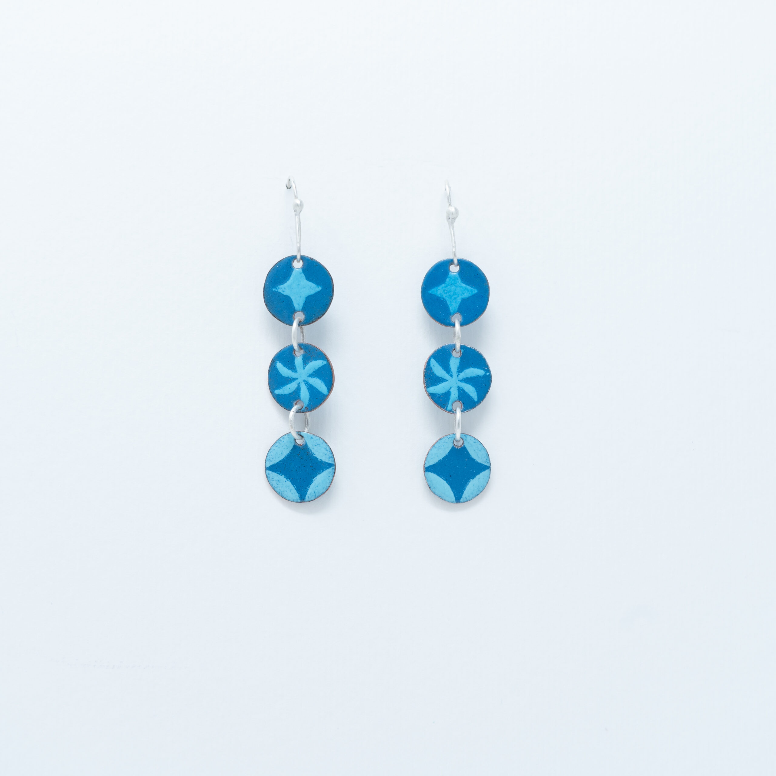 Handmade vitreous enamel earrings. Inspired by different designs seen on tilework during my travels in Andalucia, Spain.