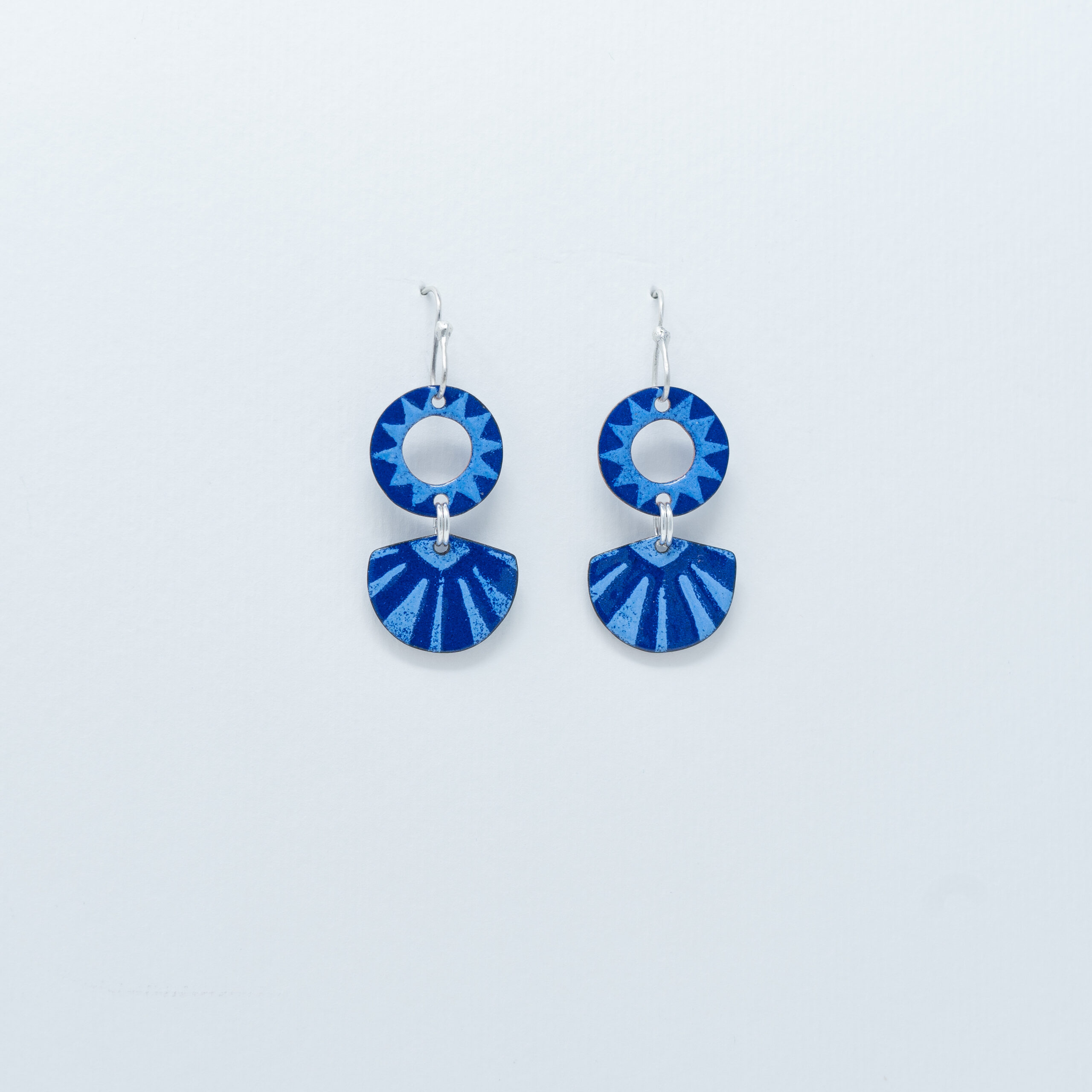 Vitreous enamel has been fired onto  copper design shapes at a temperature of around 830 degrees centigrade.   Each piece has had multiple firings and is time consuming to make. Length is 3.5cm excluding the handmade silver earring hook.