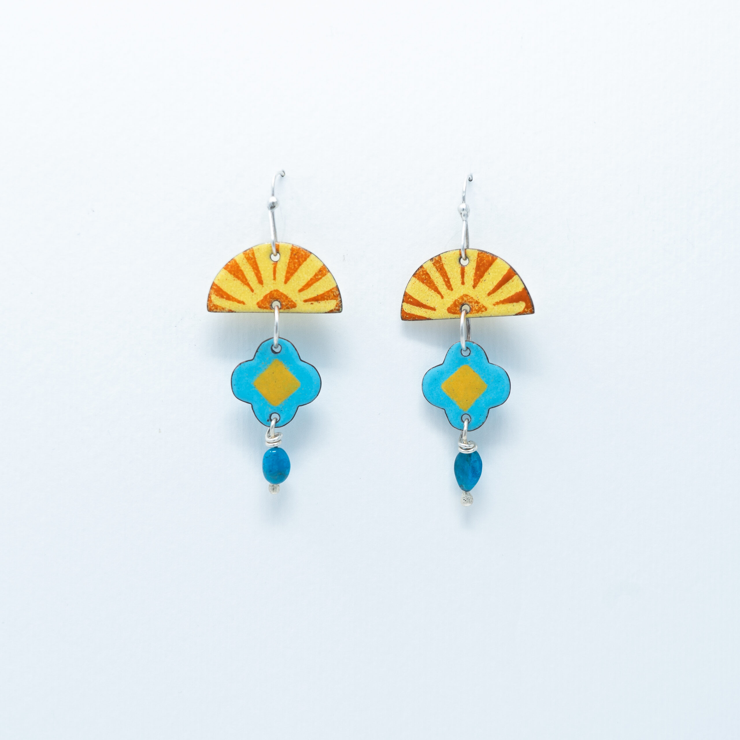 Handmade vitreous enamel earrings. Inspired the Camino shell and repeating patterns seen on my travels around Andalucia. The earrings have a sterling silver soldered hook.