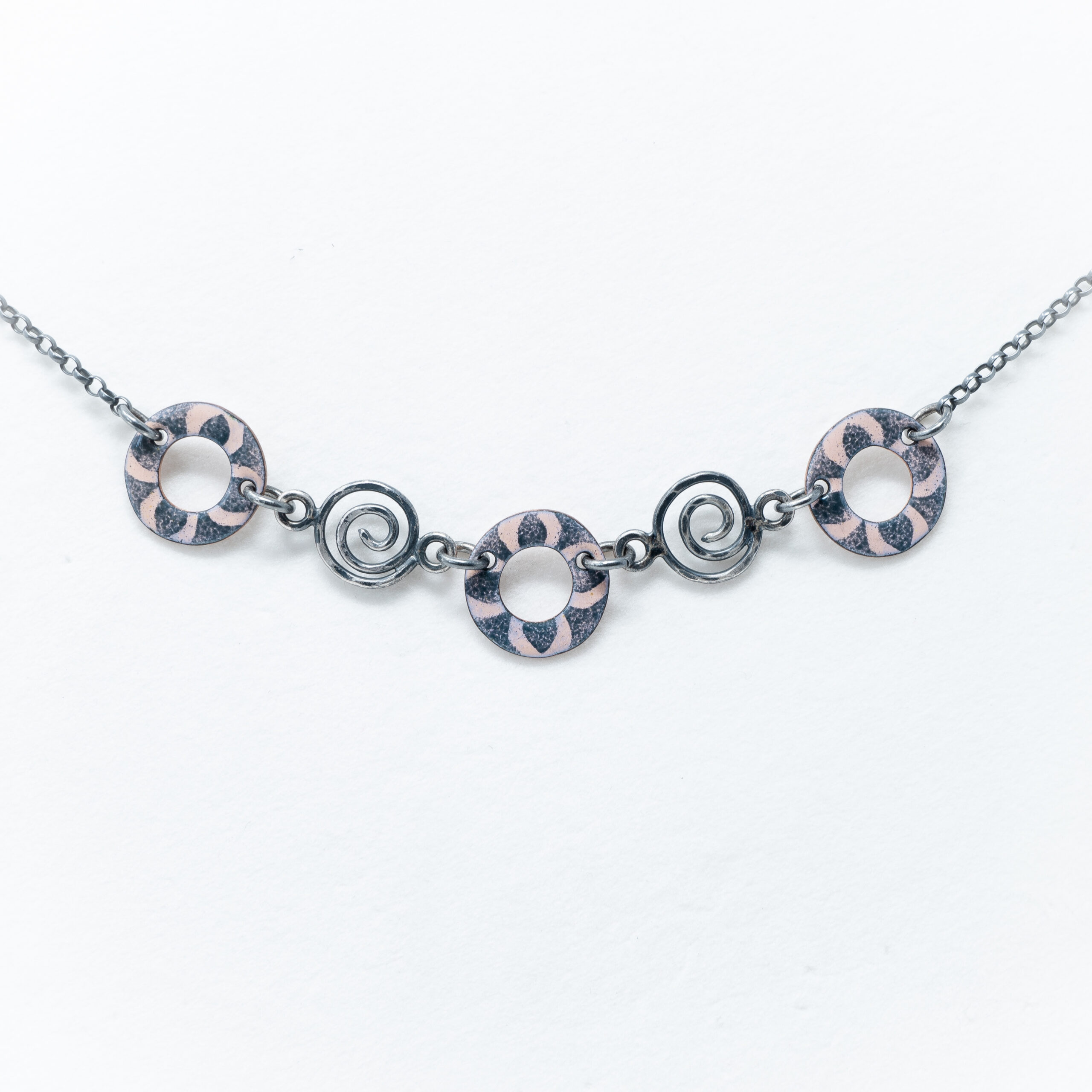 Handmade vitreous enamel an sterling silver necklace.  Spirals are some of the oldest geometric shapes and represent evolution, growth and the cycle of life. Handmade silver spirals are used together with repeating geometric patterns to create this necklace.