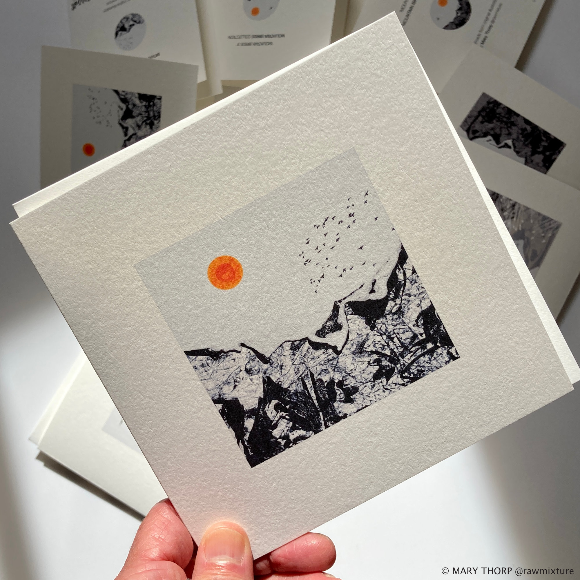 I love this series of cards by Mary Thorp printed from an original artwork. It reminds me of been on a walk in the Lake District and catching the early evening sunset with the birds flying past.