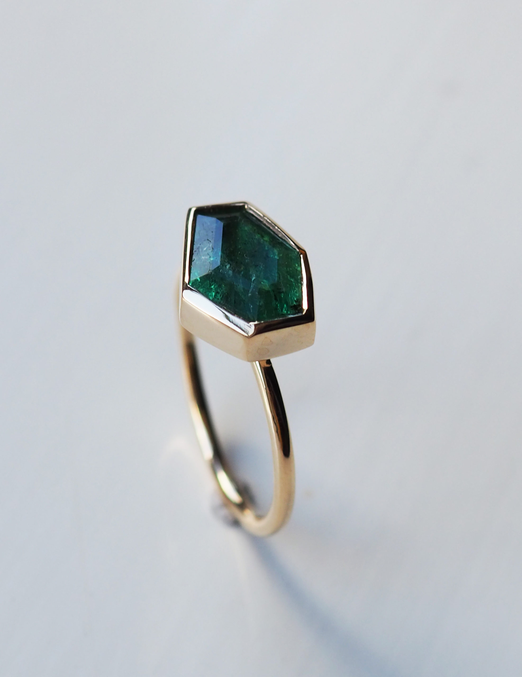 Made from 9ct yellow gold with a polished finish, with a bezel set Zambian Emerald.