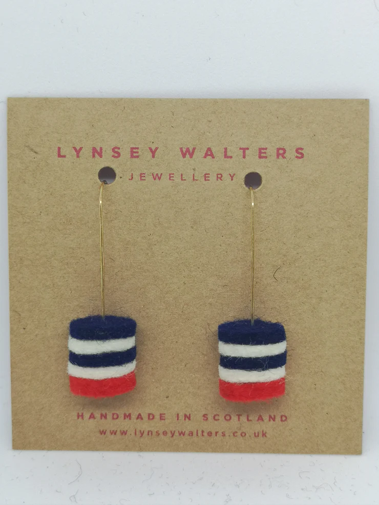 A little felt striped cylinder on a sterling silver wire hook.