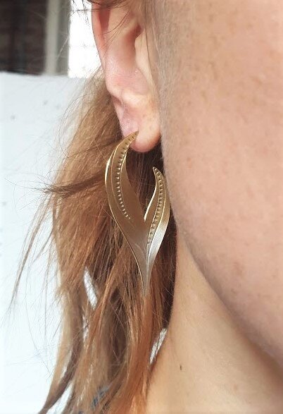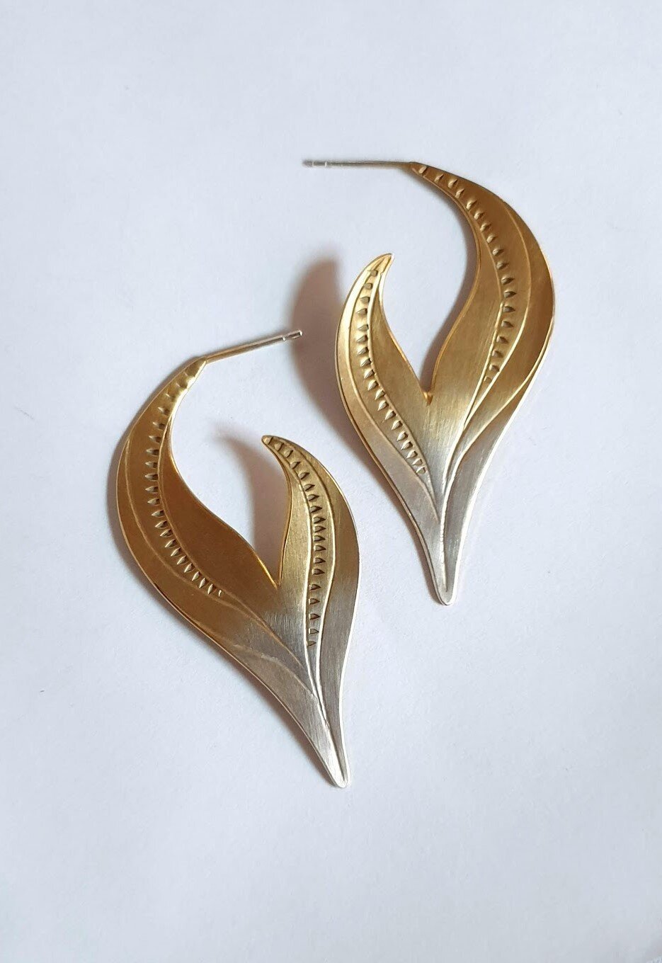 A statement pair of hoop earrings in a beautiful shard tulip shape with organic textured created with chasing hammers. These earrings are the perfect statement hoop for special occasions like weddings or evening meals out, or like me you can simply wear them with a pair of jeans everyday.