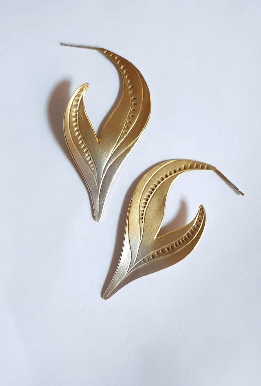 Sterling silver chased earring with two tone colours, solid silver and 18ct yellow gold plate detail