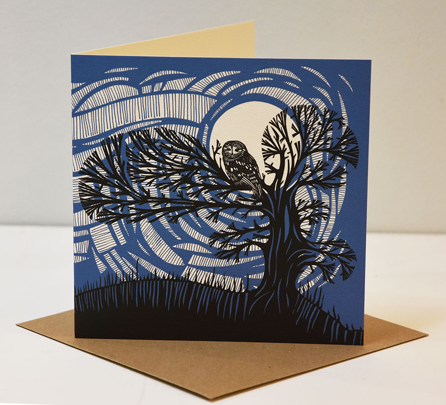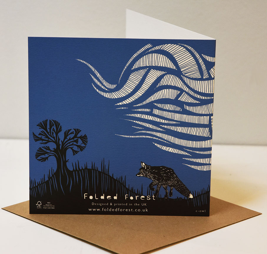 Beautiful midnight owl scene with a sneaky fox pictured on the back on a gorgous blue card