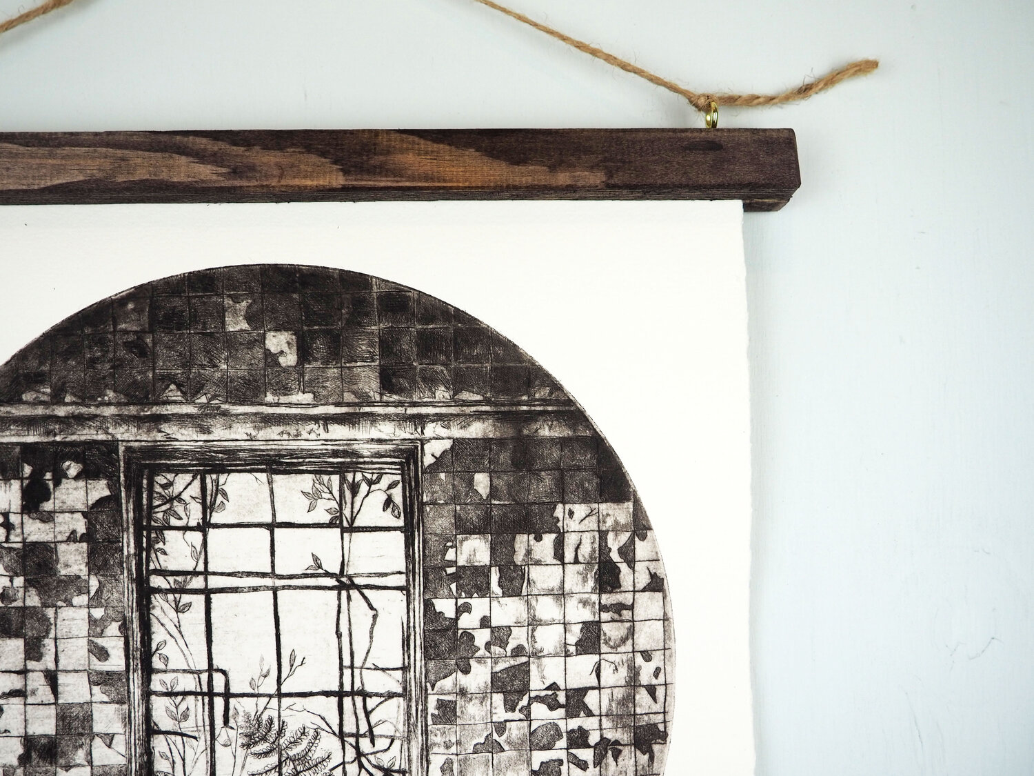 The string hands from the wooden baton frame on a single panel pin in the gallery