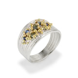 A shower of delicate ocean toned sapphires and 18ct gold droplets adorn a generous tapered band of silver strands.