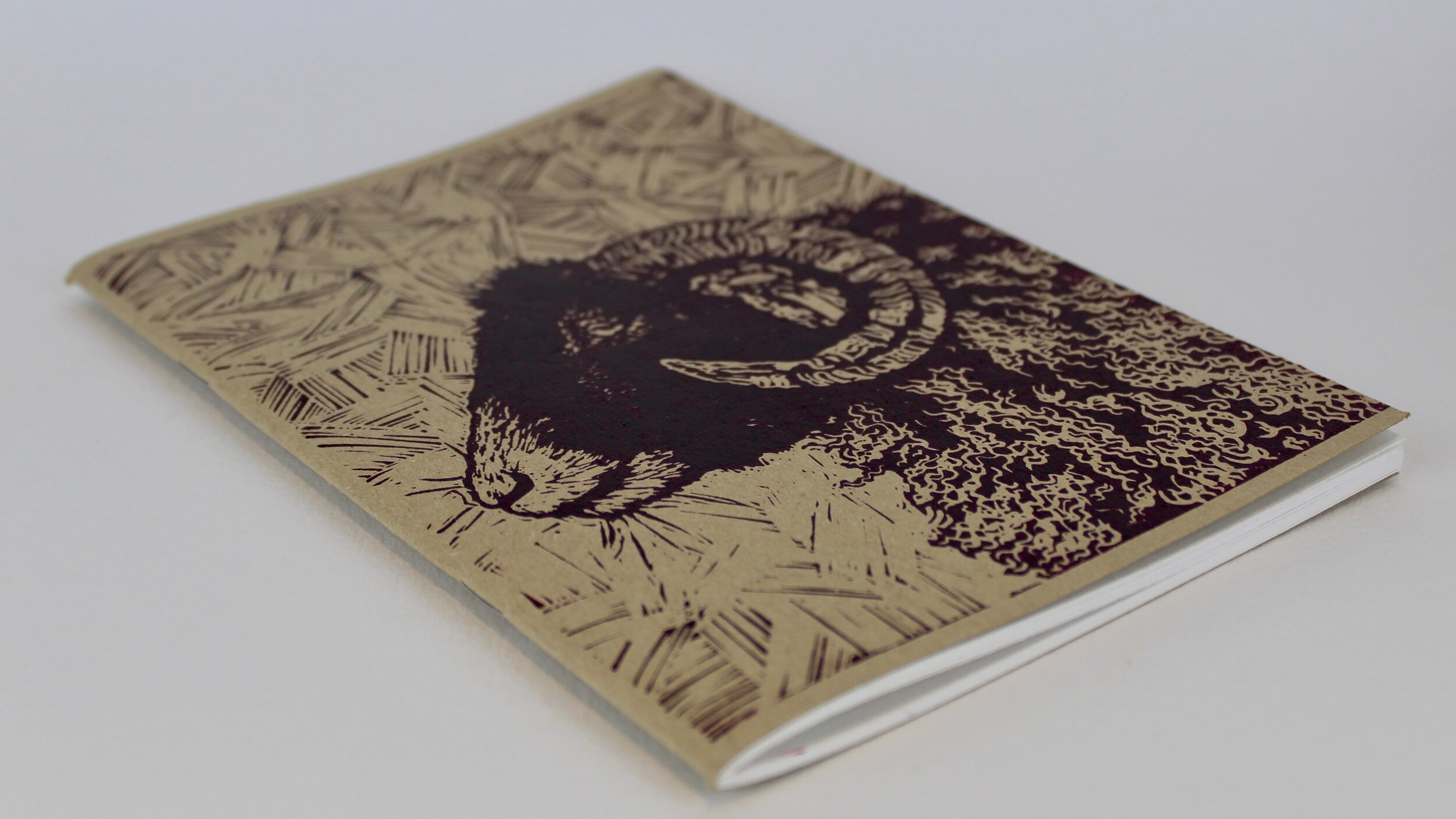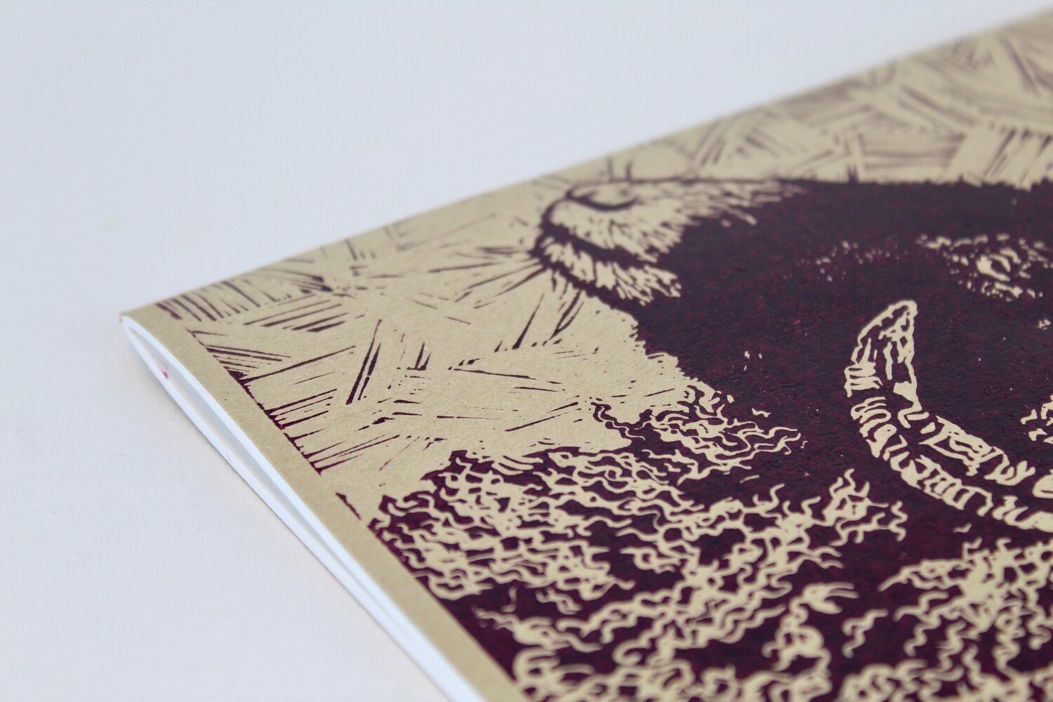 This is a soft back Lino printed notebook/ sketchbook with Kraft card cover and thick paper inside. Blank Pages