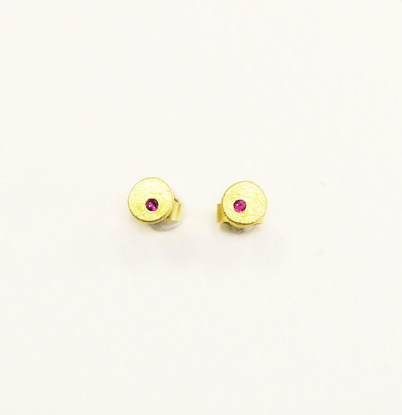 18ct yellow gold brushed matt finish studs with flush set rubies.