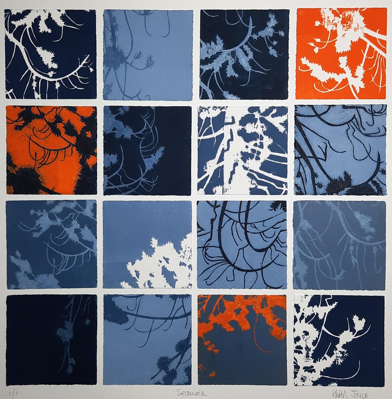 We love Karens work and especially how she creates a grid form from many collagraphs to create one print. The suggestive references of botanical flora and fauna in this print is beautiful and the colour palate of deep orange and blues makes this print really stand out and sing especially mounted in a black frame.