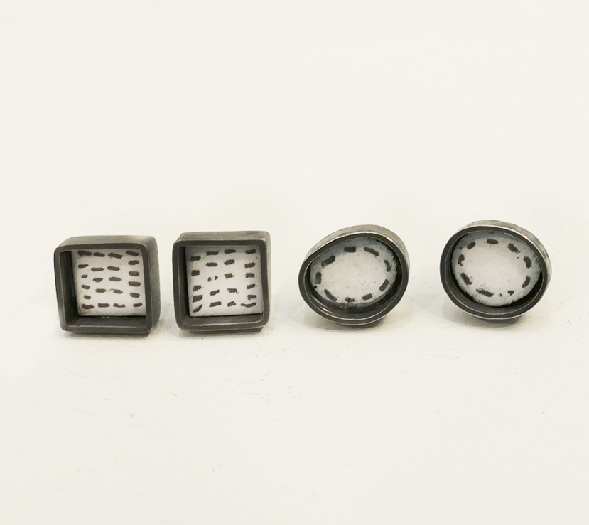 A beautiful statement pair of earrings perfect for everyday wearing, featuring a white enamel section framed in an oxidised silver frame.