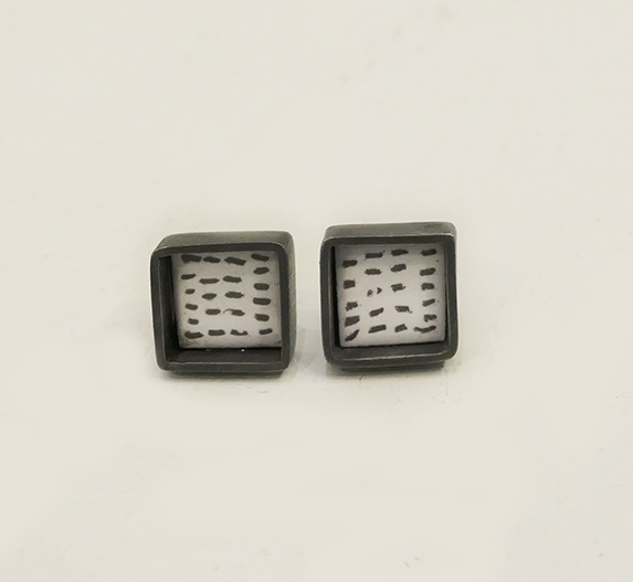 A beautiful statement pair of earrings perfect for everyday wearing, featuring a white enamel section framed in an oxidised silver frame.