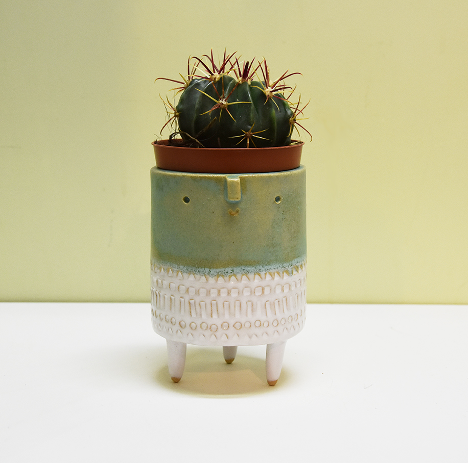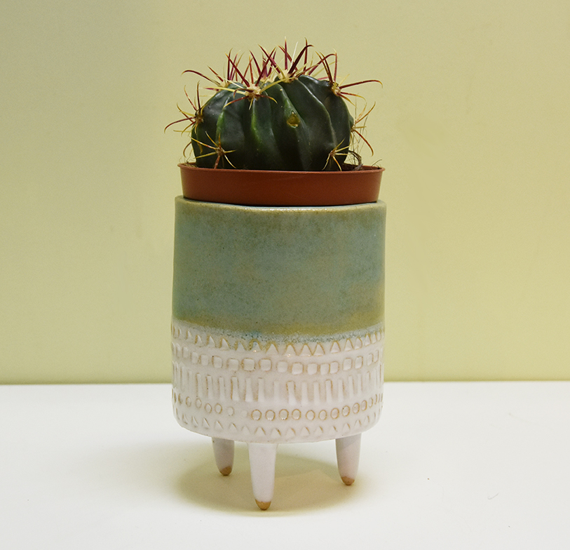 Glazed with Matt Green/ Turquoise glaze and a shiny white glaze with geometric