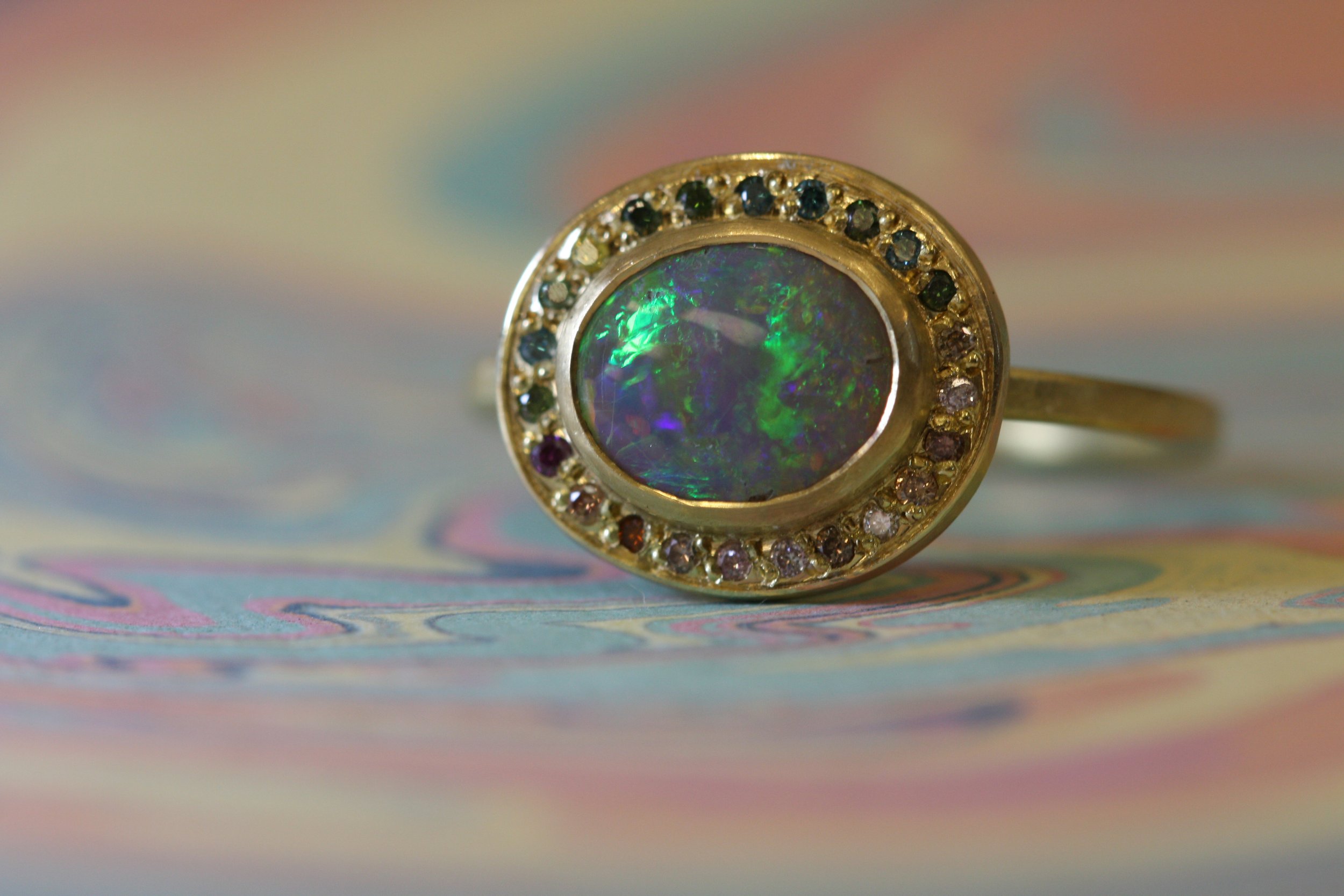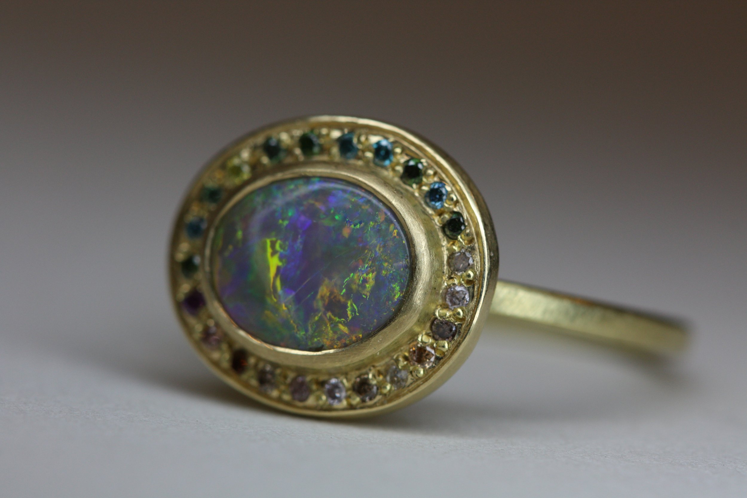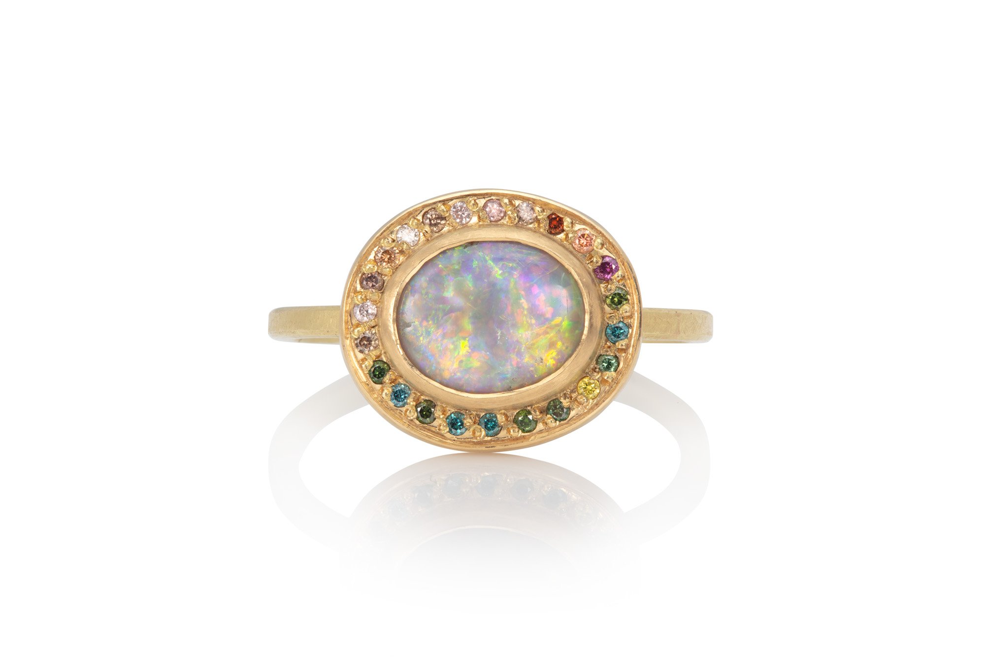 The Opal is set in 18ct yellow gold and surrounded by a multitude of coloured diamonds that match and mirror the flashes of colour within the stone. The band is a comfortable inverted D profile band meaning it’s curved on the inside while maintaining a geometric edge on top. The setting is set on top of the band so its perfect for stacking with other rings.