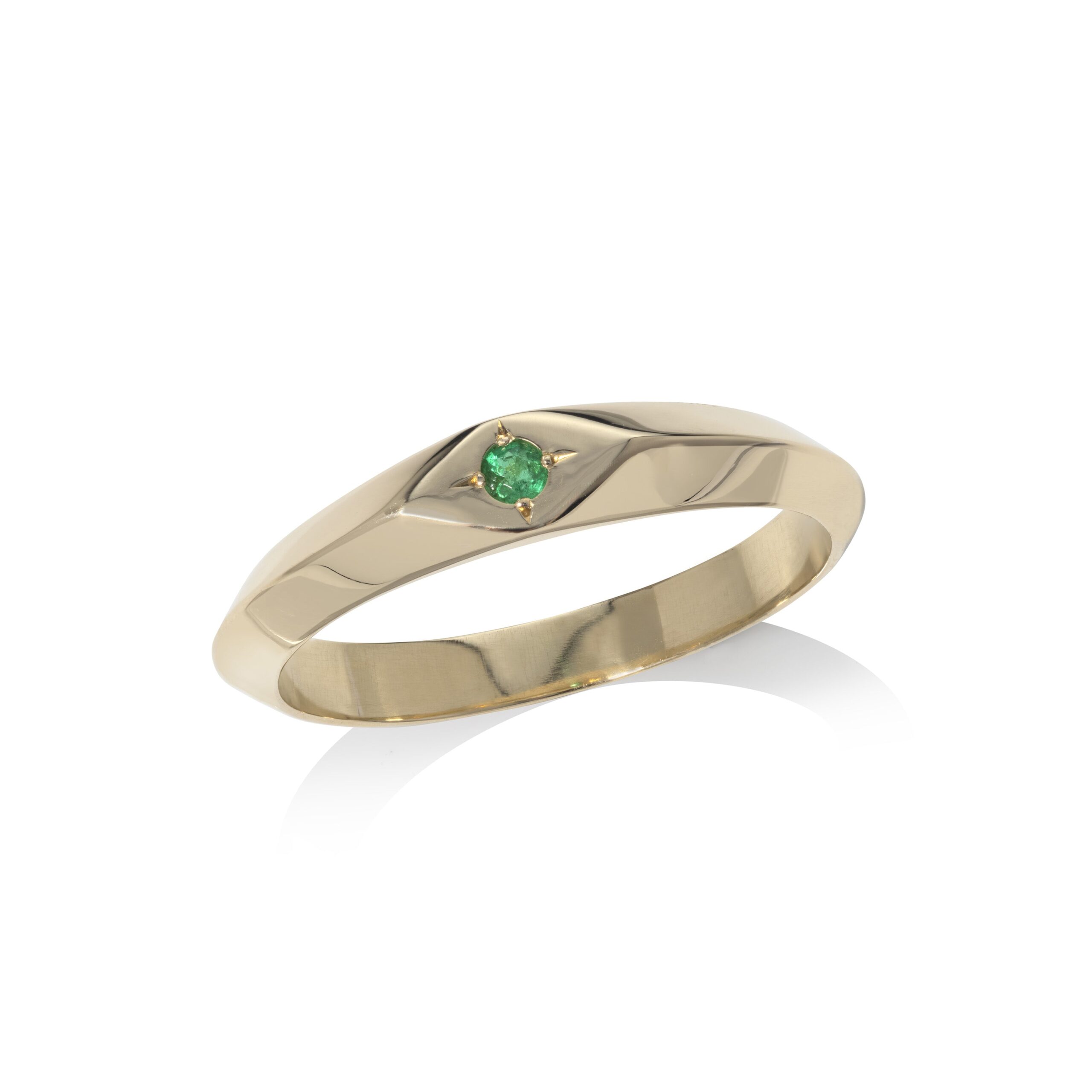 Made from 9ct recycled yellow gold with a flush star set emerald in the centre