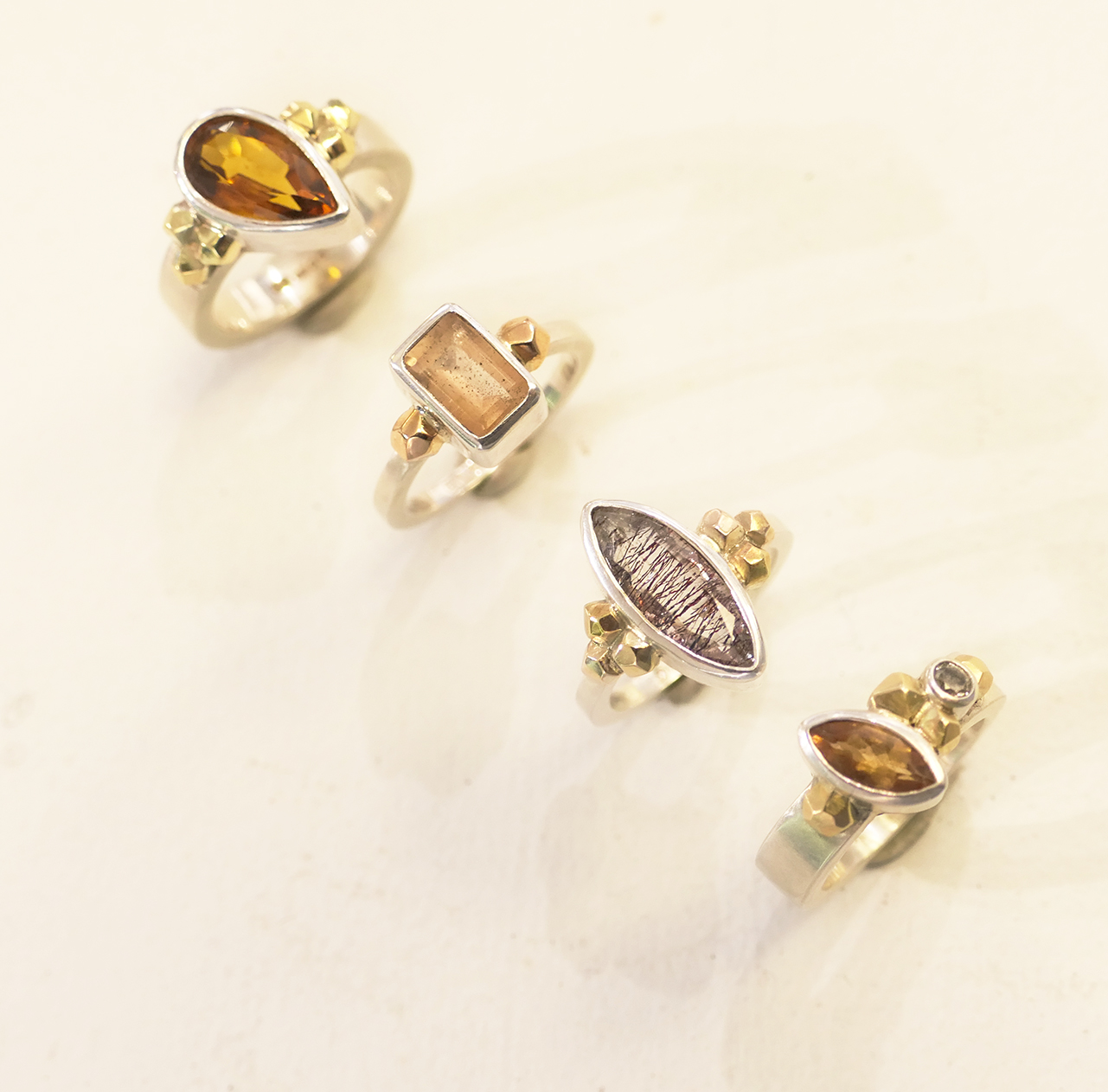 A beautiful statement ring by Yorkshire jeweller Evie Leach with a hint of 9ct yellow gold granulation on the shoulders of the band. We love the chunky yet very comfy bands Evie creates in this style of ring combined to the beautifully bezel set stones, giving these rings a modern yet classic feel.