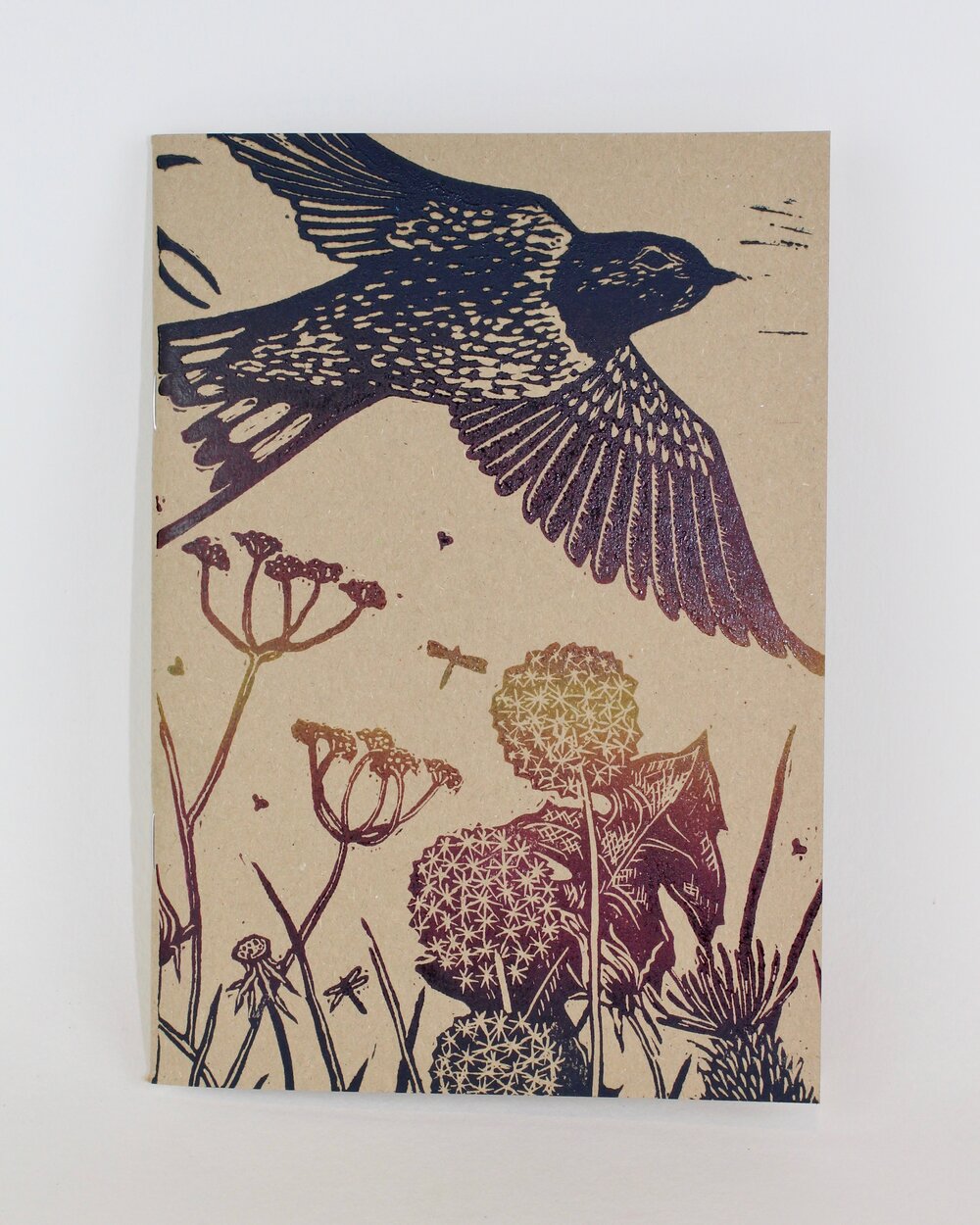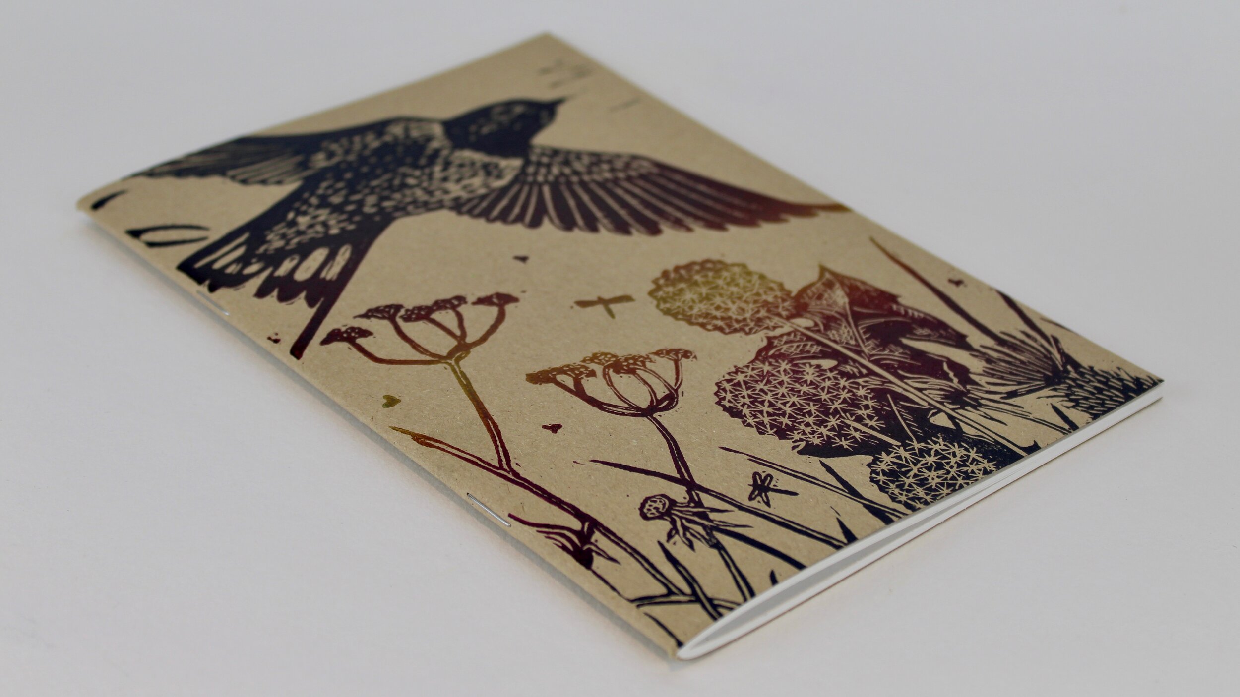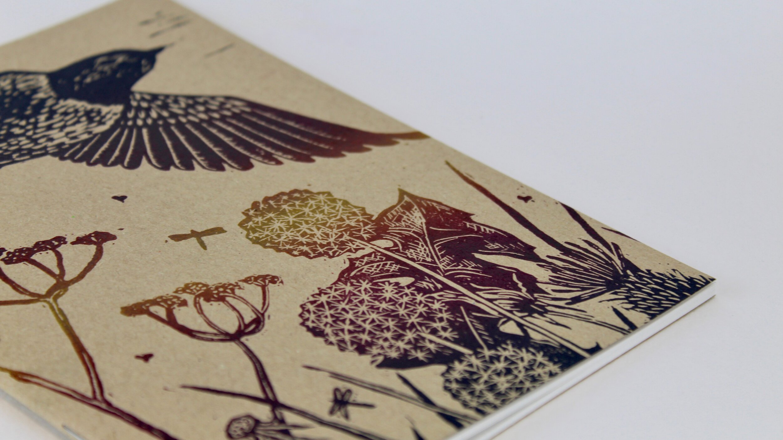 This is a soft back Lino printed notebook/ sketchbook with Kraft card cover and thick paper inside. Blank Pages