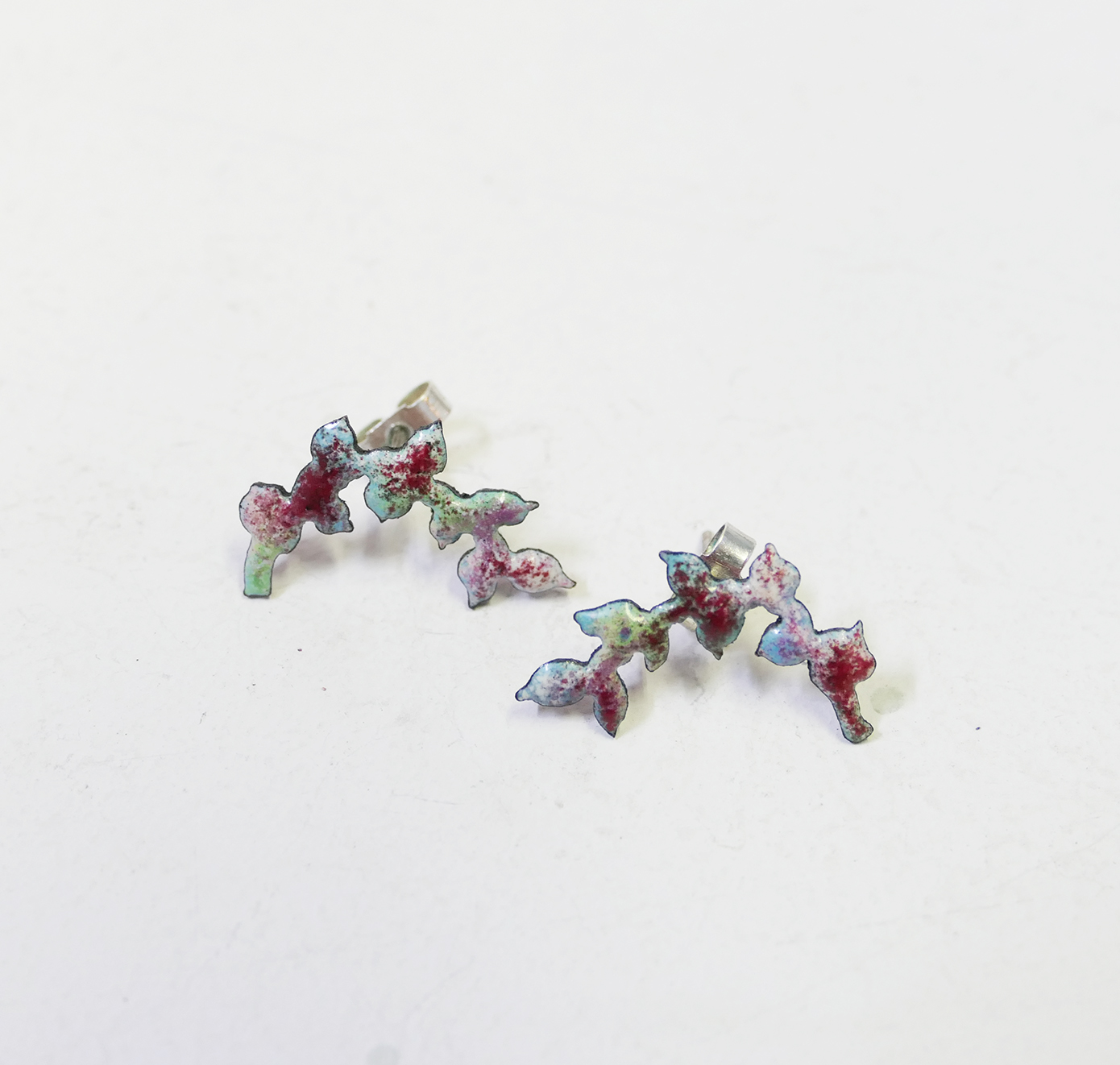 Enamelled on the front and a simple colour is applied to the back, their is a solid sterling silver 0.8mm post and butterfly clip added to each earring