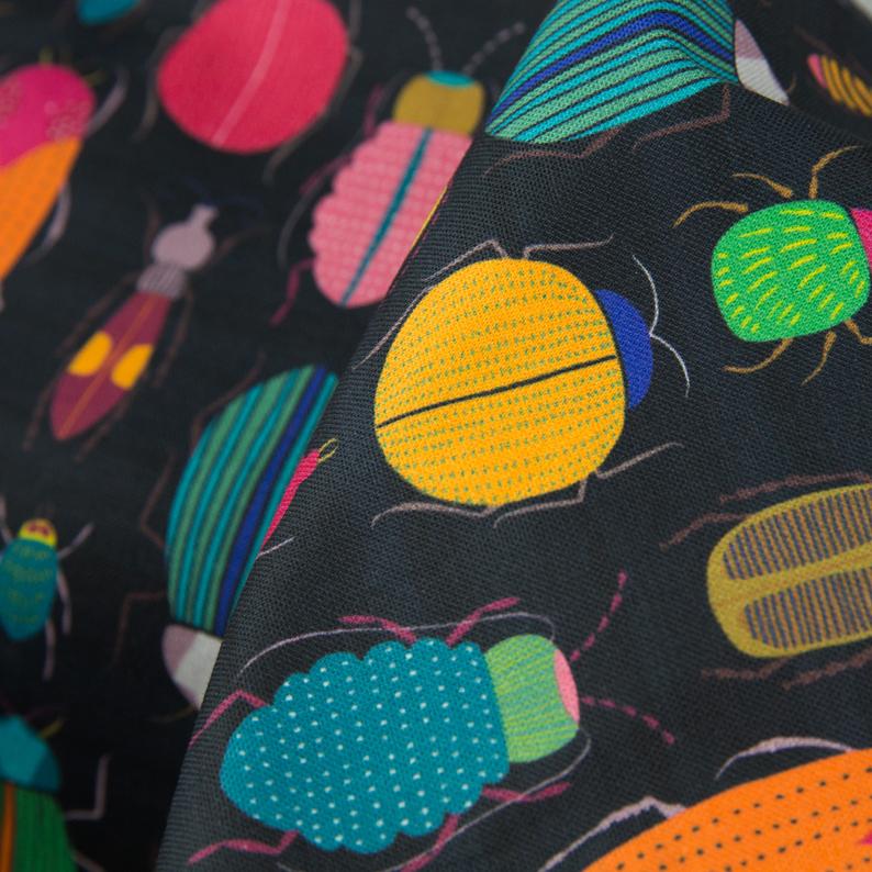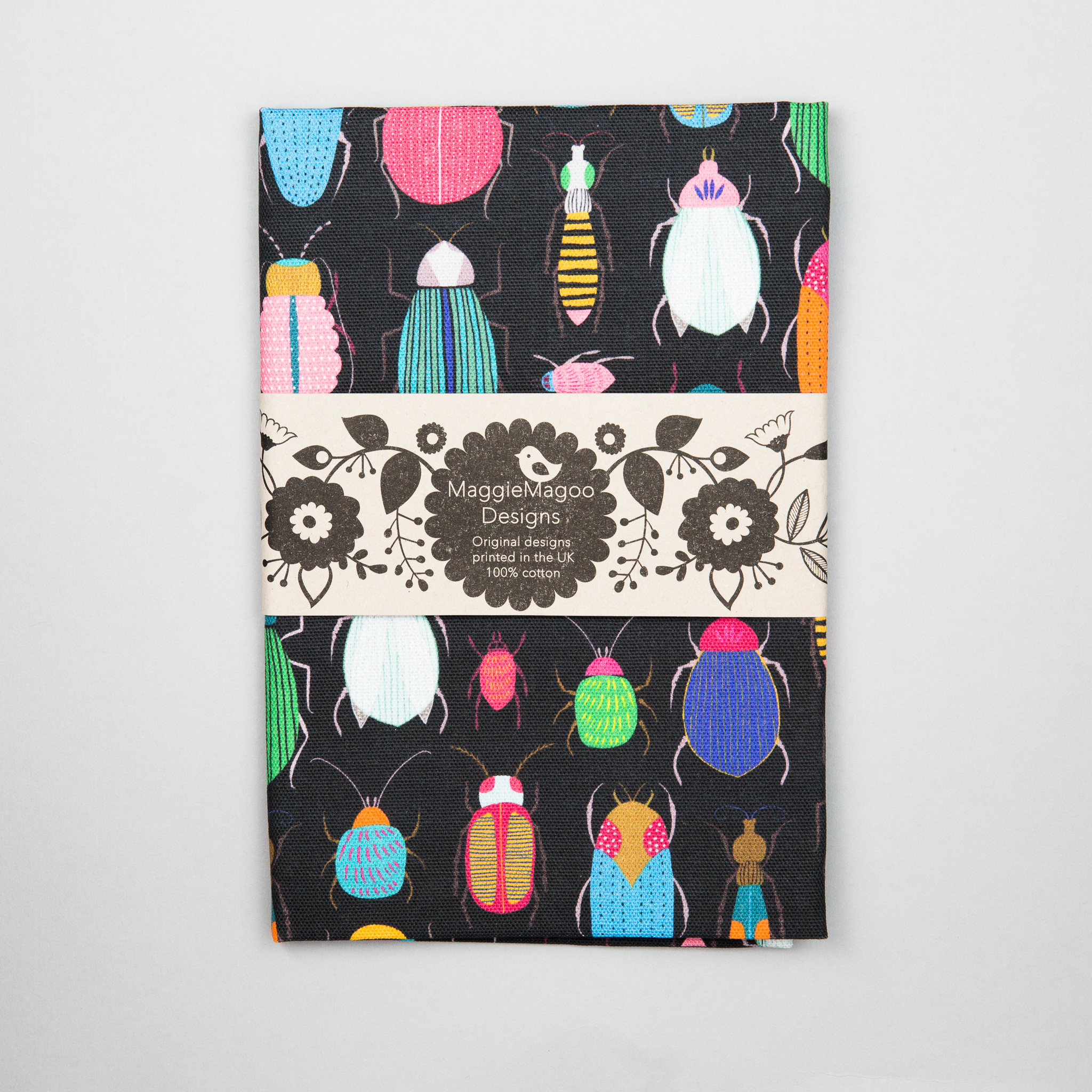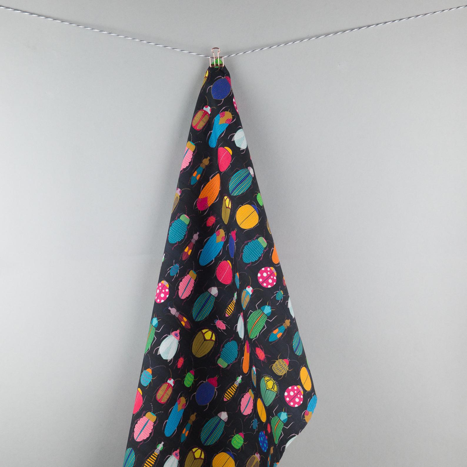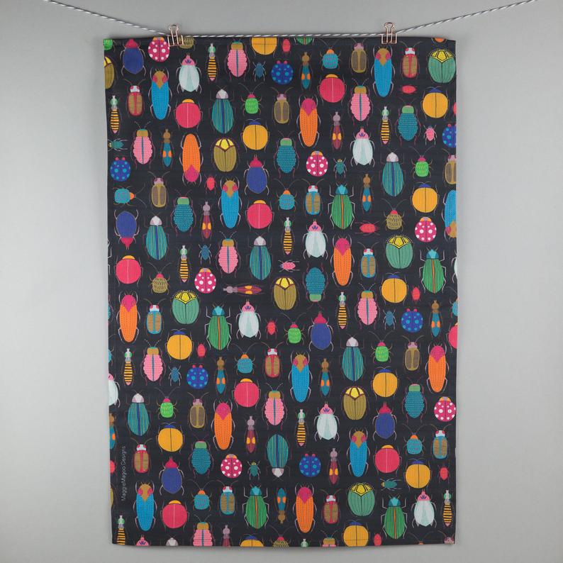 A fun colourful beetle print tea towel in the dark background design. We think these folklore inspired tea towels make the perfect house warming gift and can be used in the kitchen or equally is beautiful framed.