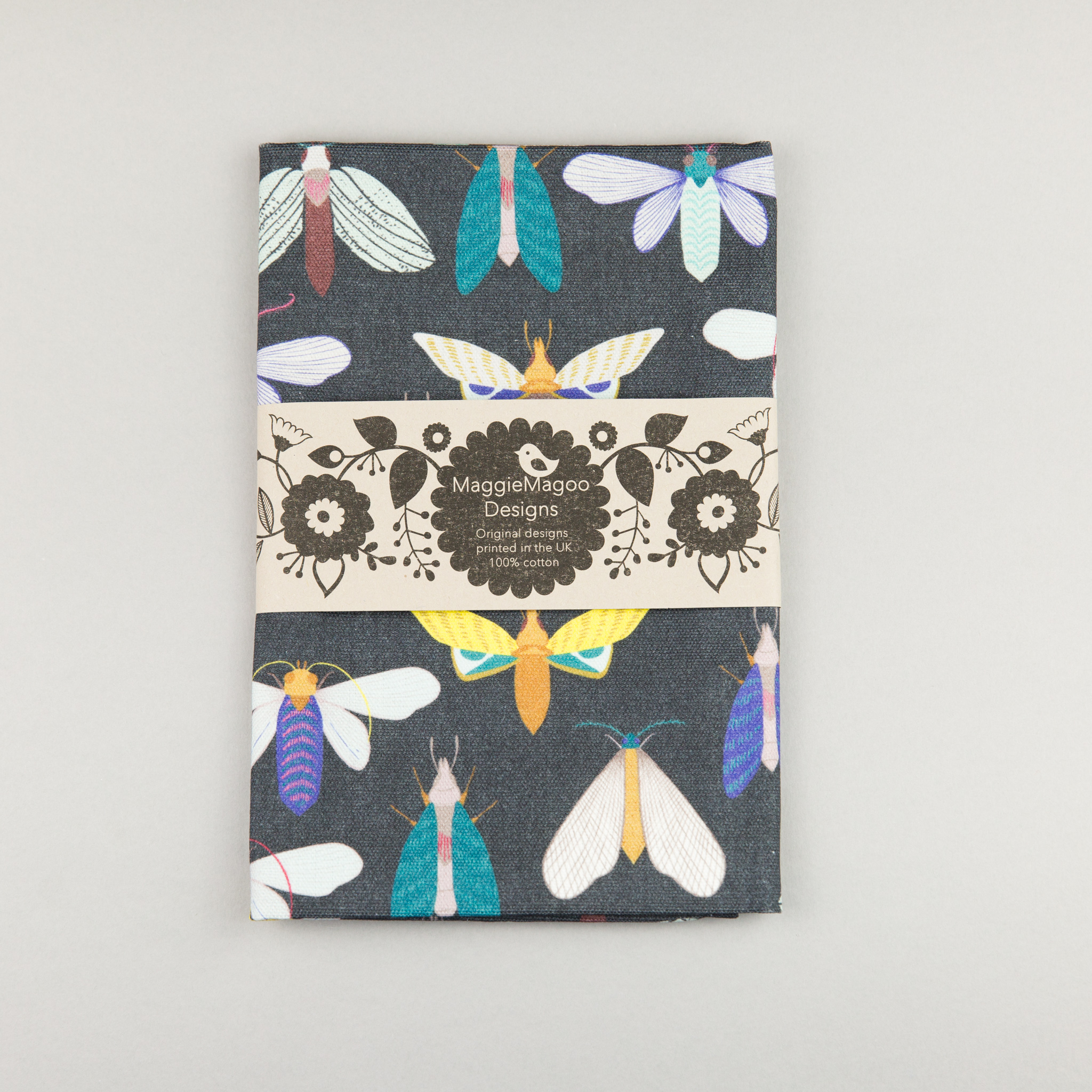A fun colourful moth print tea towel in the dark background design. We think these folklore inspired tea towels make the perfect house warming gift and can be used in the kitchen or equally is beautiful framed.